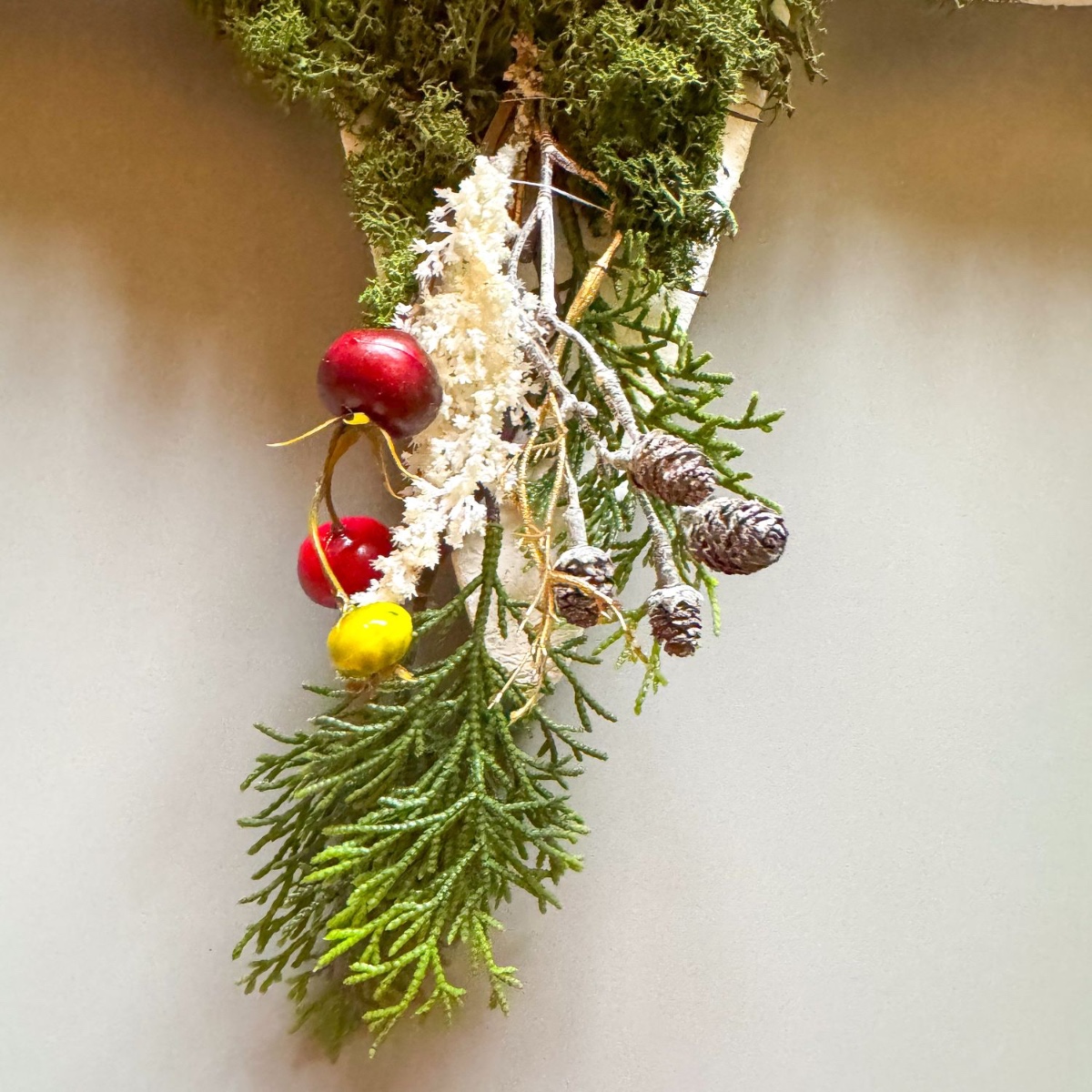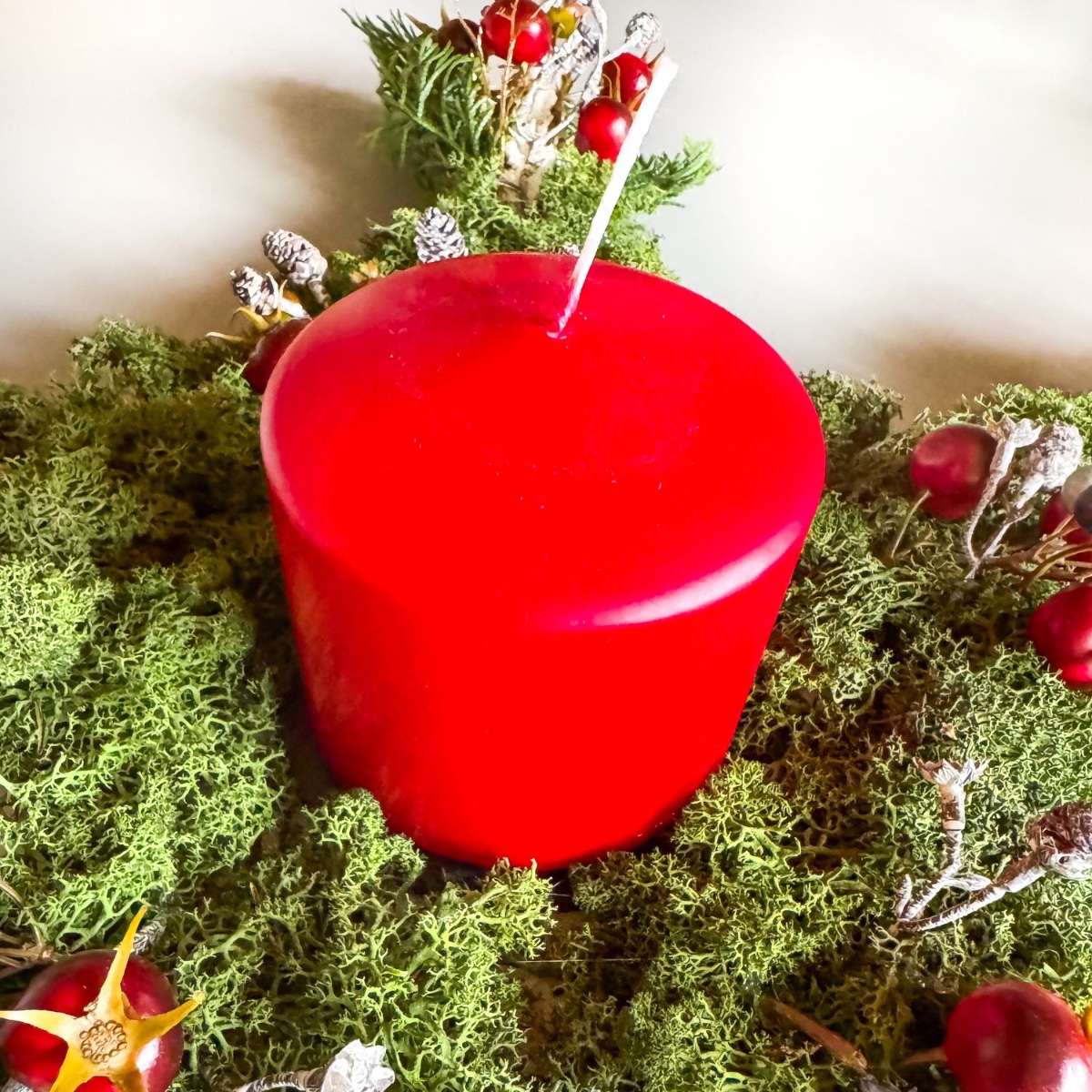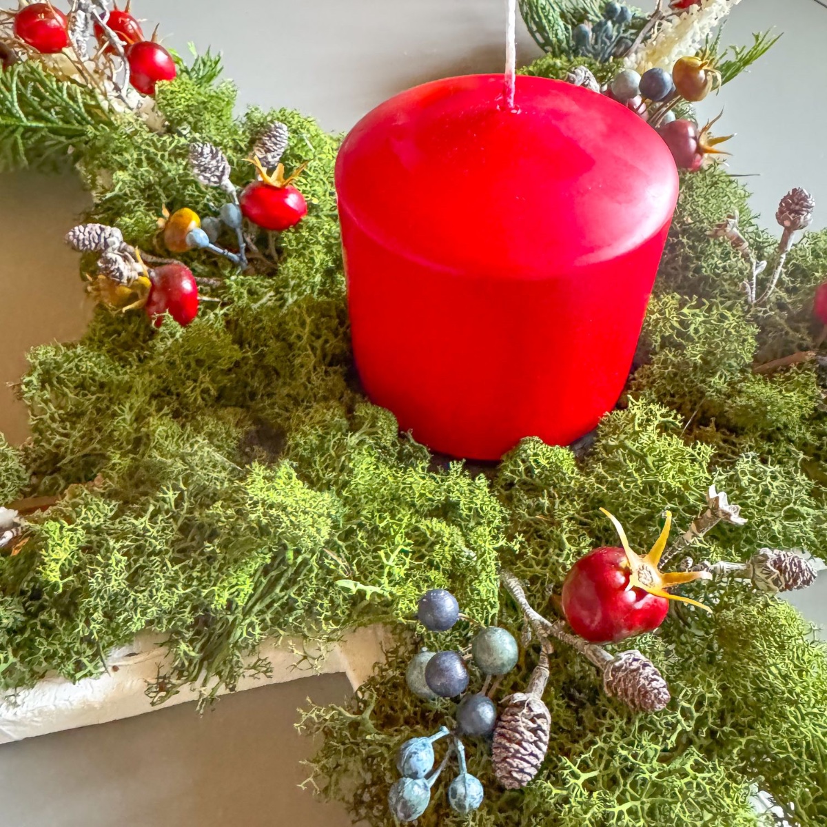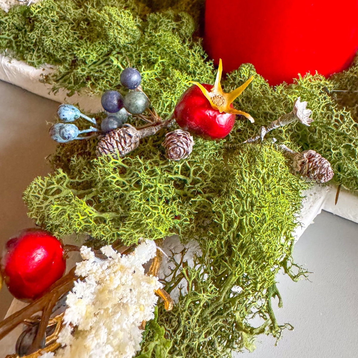 Natürlich festlich – ein Stern voller Wärme! Ein kunstvoll arrangiertes Gesteck in Sternform, geschmückt mit sattgrünem Moos, Tannenzweigen und feinen Beerenakzenten. In der Mitte erstrahlt eine kräftig rote Kerze – ein leuchtender Kontrast, der Wärme und Festlichkeit ausstrahlt. Das Arrangement ist ein eleganter Blickfang auf dem Esstisch oder Wohnzimmertisch für die Winter- und Weihnachtszeit. Shop the Look!