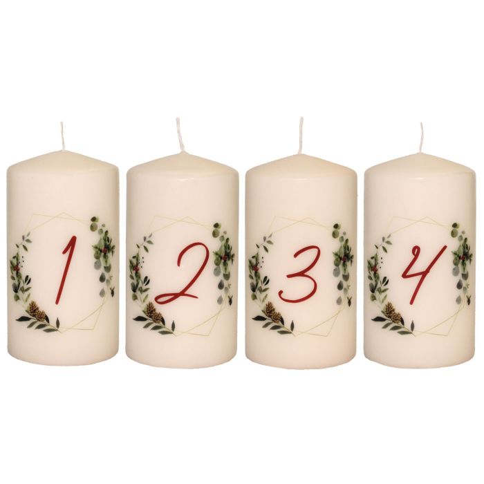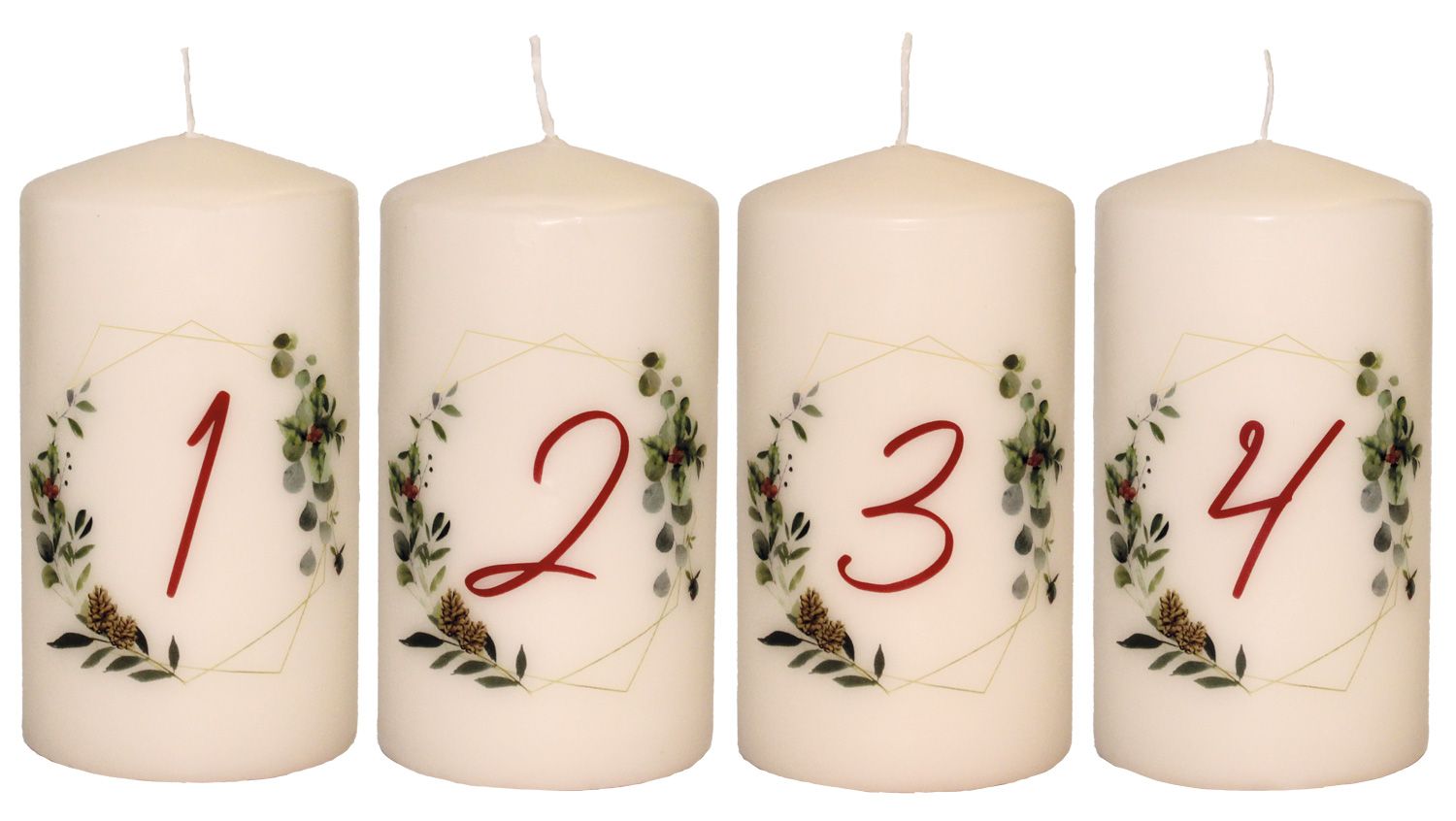 Adventskerzen CHRISTOPHORUS mit Zahlen Fotodruck, 4 Stück, creme-bunt, 13cm, Ø6,8cm, 52h - Made in Germany