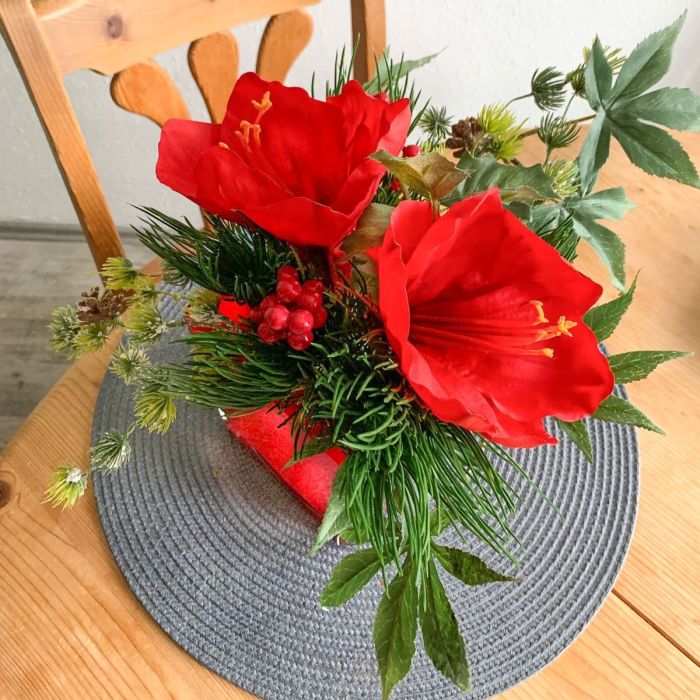 Winterglanz im roten Quadrat – pure Eleganz mit Amaryllis! Ein modernes Wintergesteck, das Eleganz und Festlichkeit vereint: Die majestätische Amaryllis erhebt sich stolz aus einem tiefroten Glaswürfel, der ihr einen edlen Rahmen verleiht. Der satte Farbkontrast von leuchtendem Rot und frischem Grün bringt winterliche Wärme in jedes Ambiente. Schlichte Raffinesse, die sowohl als Tischdekoration als auch als stilvolles Geschenk bezaubert. Shop the Look!