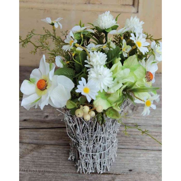 - Gesteck besteht aus Stiefmütterchen, Anemonen, Hortensie, Margerite und Kornblume in der Farbe weiß aus hochwertigen Materialien