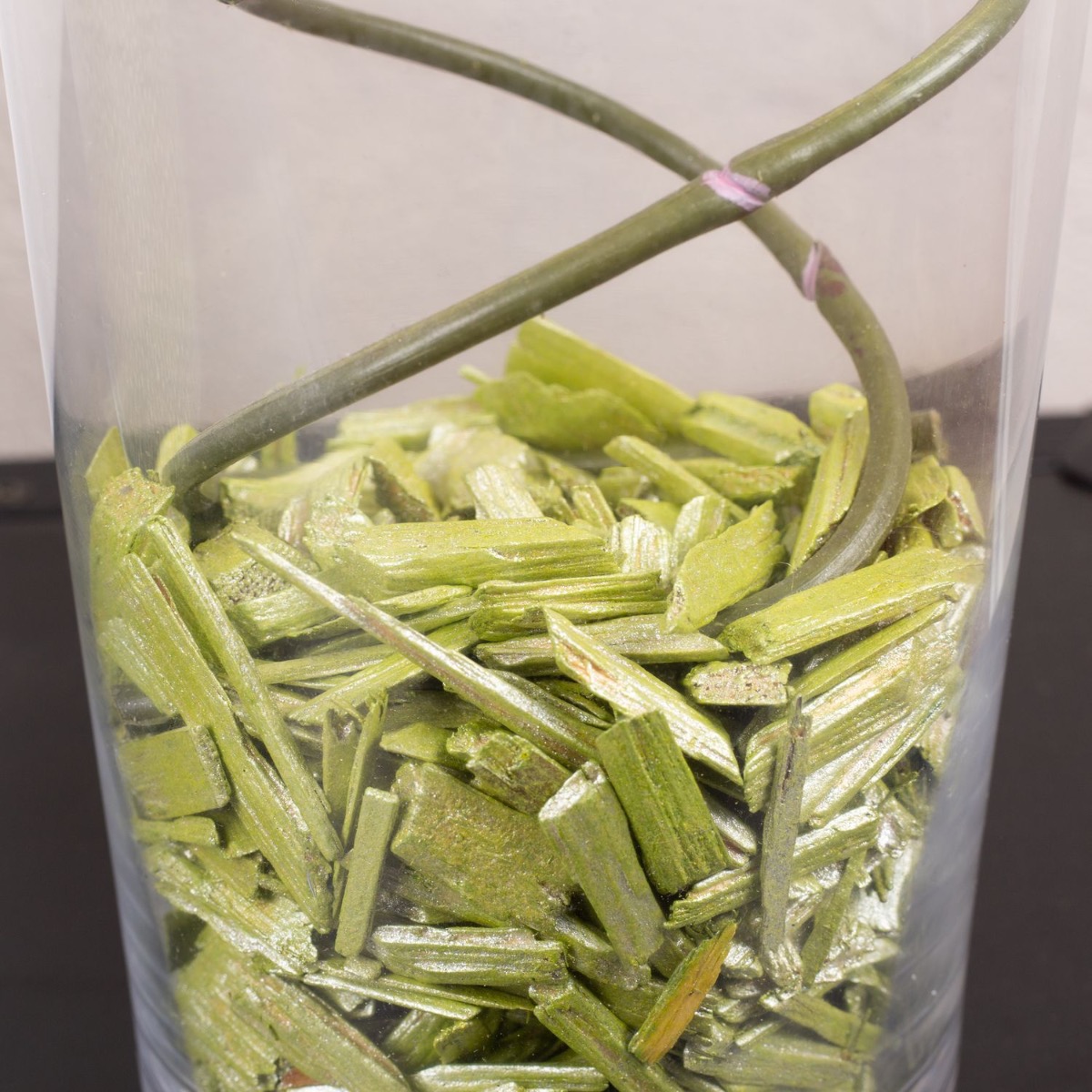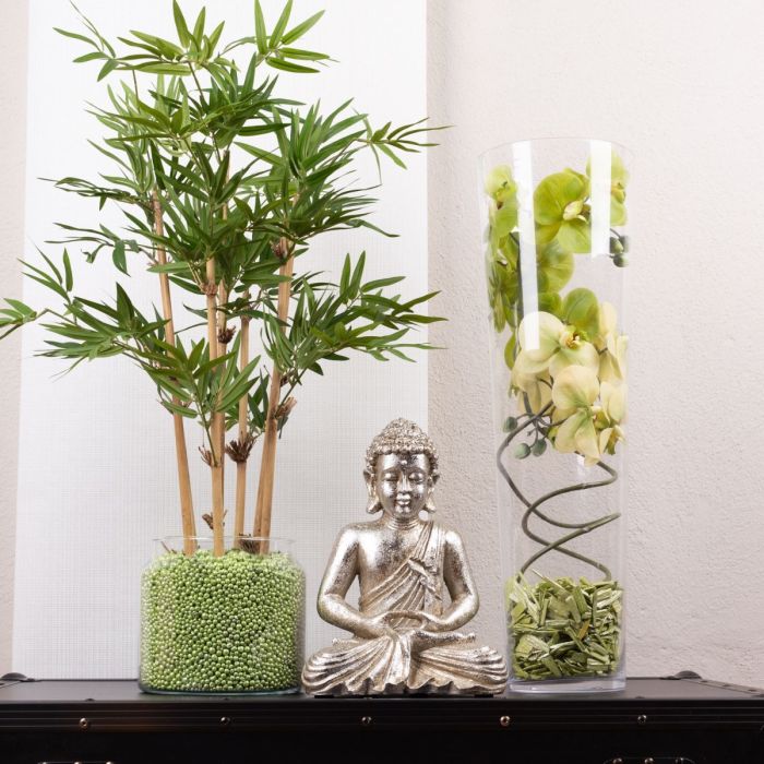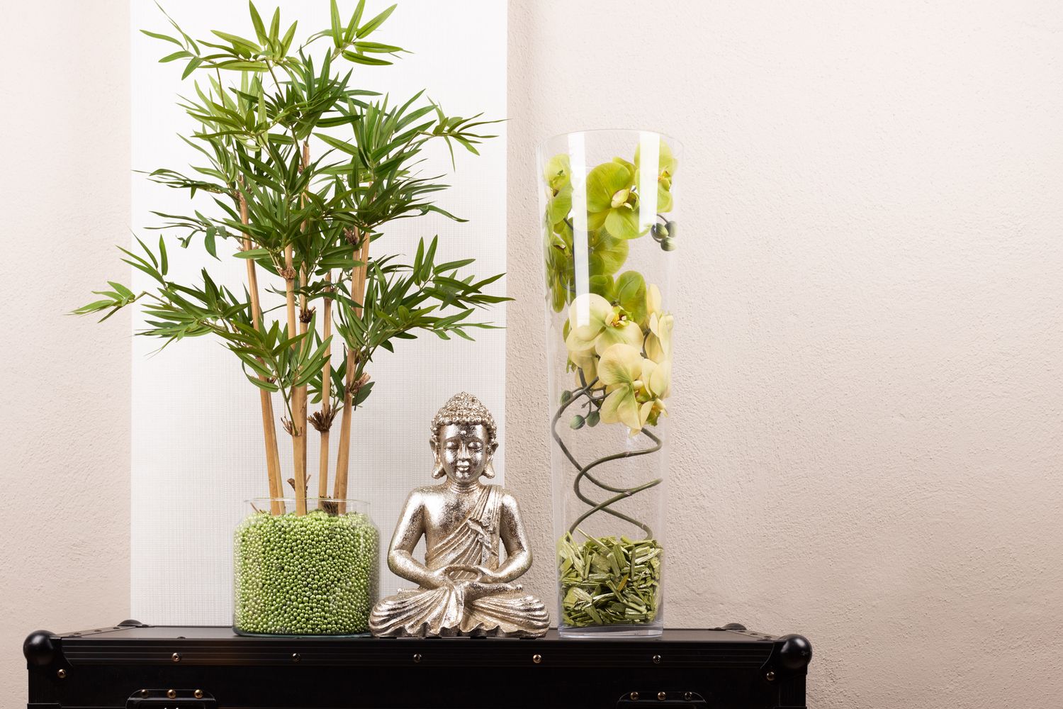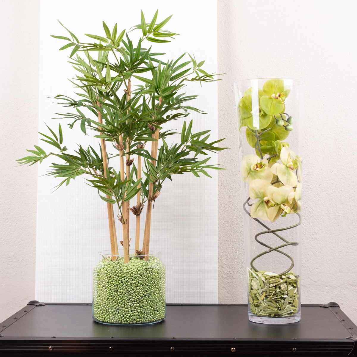 Gestaltungstipp: Die Bambuspflanze in das Pflanzglas stellen und mit farbigen Dekoperlen füllen. Die Orchideen spiralförmig zurechtbiegen und auf die große Vase anpassen. Der gefärbte Rindenmulch verdeckt die Enden der Orchideenzweige.