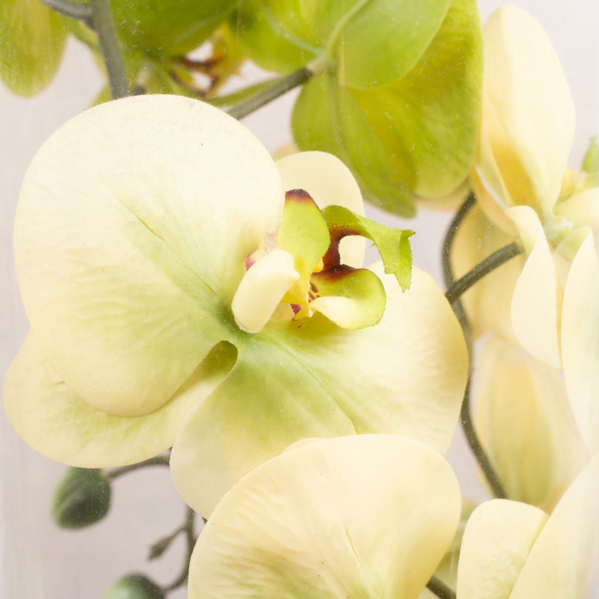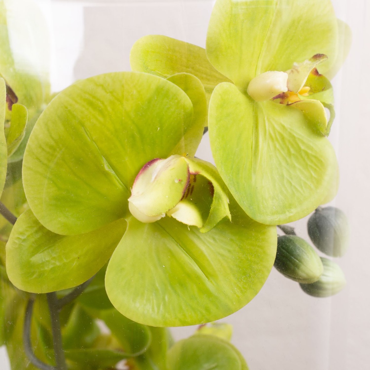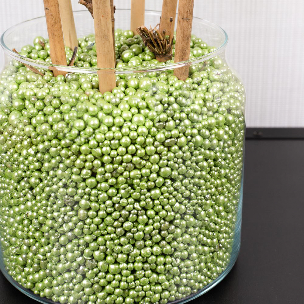 Gestaltungstipp: Die Bambuspflanze in das Pflanzglas stellen und mit farbigen Dekoperlen füllen. Die Orchideen spiralförmig zurechtbiegen und auf die große Vase anpassen. Der gefärbte Rindenmulch verdeckt die Enden der Orchideenzweige.