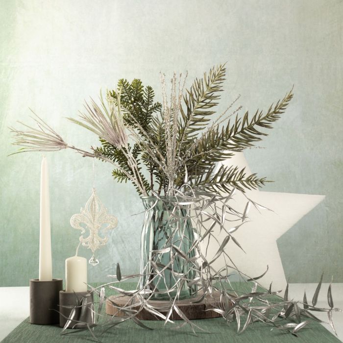 Blasses Grün und Glitzer! Die Weihnachtszeit ist zu Ende und die ruhige Zeit zwischen den Jahren hat begonnen. Die Vorbereitungen für den Silvesterabend laufen und man genießt die Ruhe. Dieser Winterlook läutet das bevorstehende Silvesterfest ein. Der glitzernde Kiefernzweig und der grünlich-weiße Pinienzweig wirken wie ein Feuerwerk. Umrahmt von weihnachtlichen Zweigen, und silberner Trauerweide strahlt dieser Look ganz zauberhaft und dient auch als passende Deko für den bevorstehenden Jahreswechsel. Shop the Look!