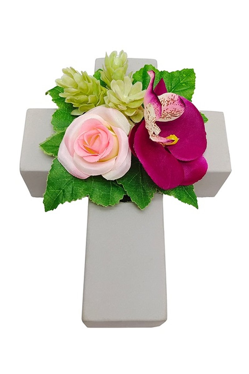 - Das geschmackvolle Blumengesteck auf einem Kreuz ist eine schöne Bereicherung z.B. für den Grabschmuck, bitte beachten Sie das wir für die Verwendung im Außenbereich keine Garantie auf die Langlebigkeit und Beständigkeit geben können, die Kunstblumen können sich durch die UV-Strahlung verfärben, brüchig werden oder durch Wind abreißen!