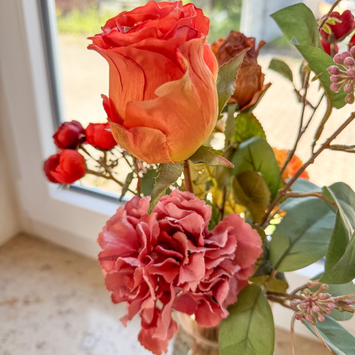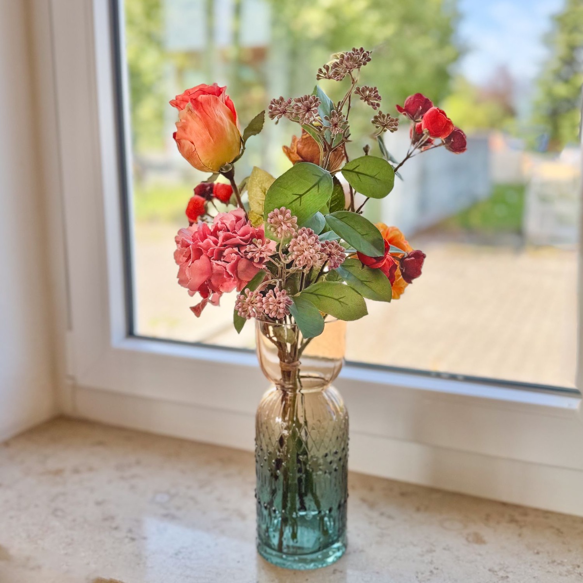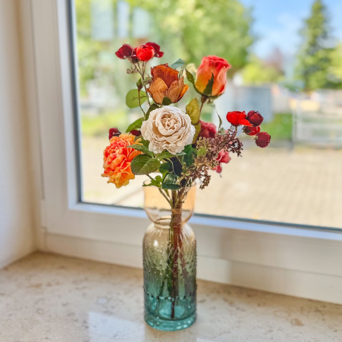 Zeitlose Pracht im barocken Glanz! Für ein im barocken Stil gestaltetes Wohnzimmer wurde dieser kunstvolle Blumenstrauß mit viel Liebe zum Detail kreiert. Naturgetreu gearbeitete Blüten – teils in edler Trockenblumen-Optik – in warmen Rot-, Orange- und Cremetönen verleihen dem Interieur einen Hauch von Romantik und stilvoller Frische. Die elegante Glasvase mit feiner Struktur rundet das Arrangement harmonisch ab und macht es zu einem außergewöhnlichen Blickfang auf Fensterbänken, Kommoden oder Tischen. Shop the Look!