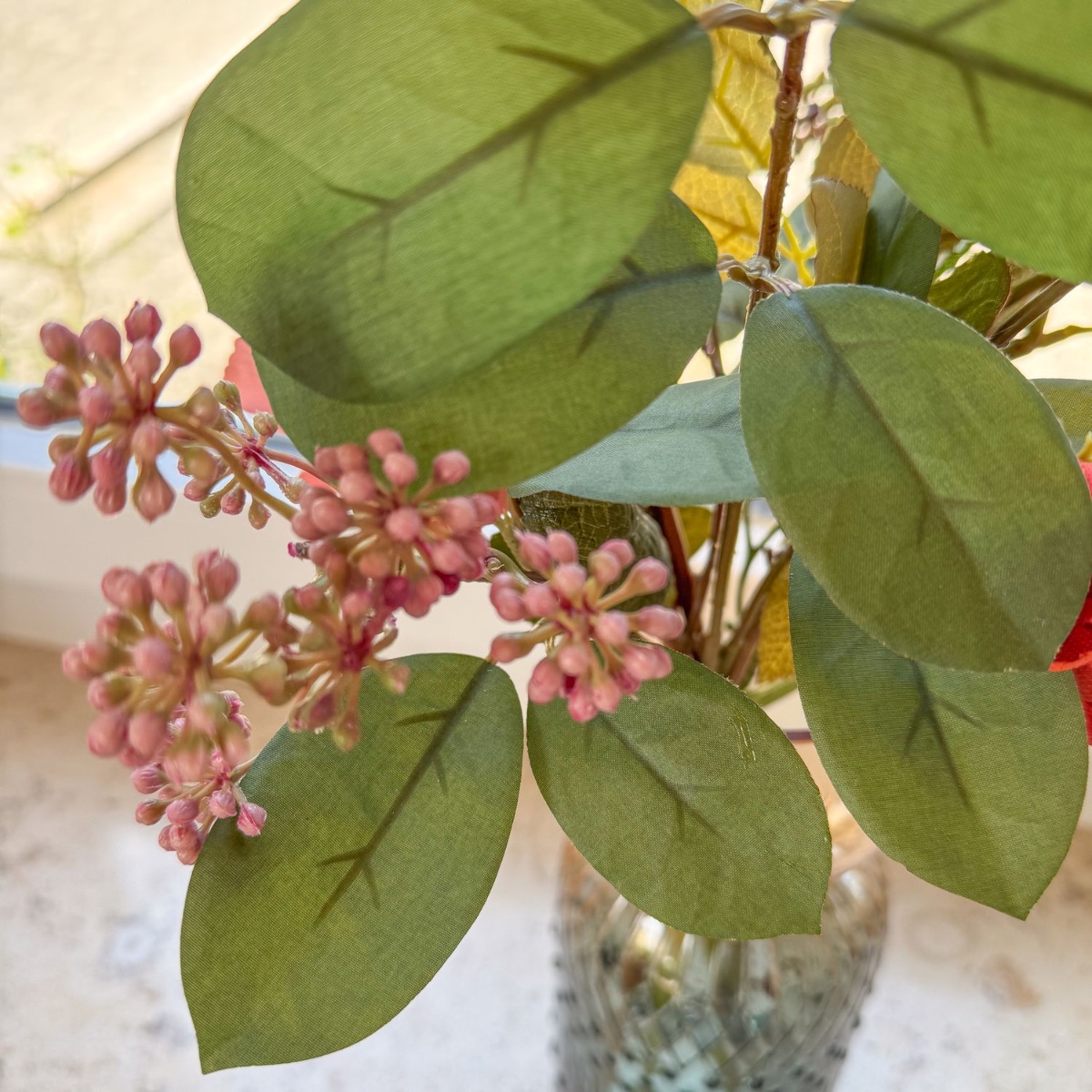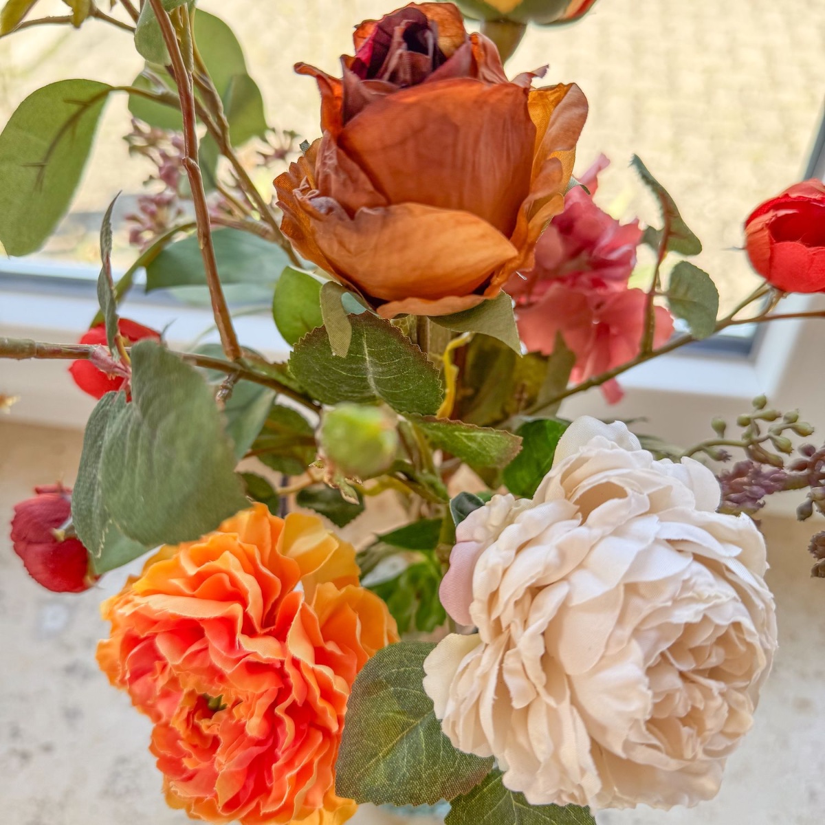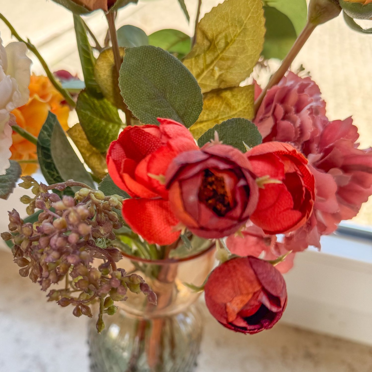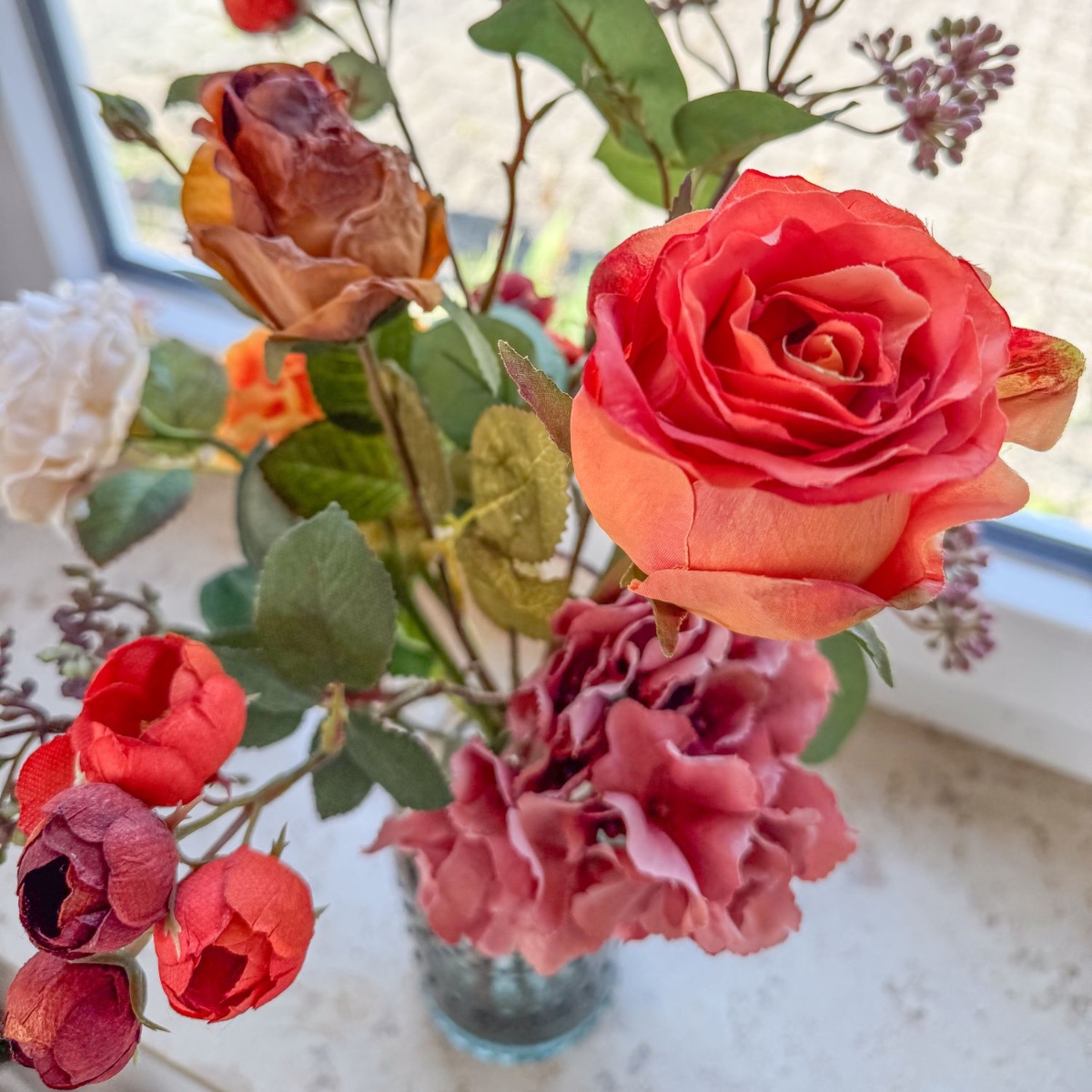 Zeitlose Pracht im barocken Glanz! Für ein im barocken Stil gestaltetes Wohnzimmer wurde dieser kunstvolle Blumenstrauß mit viel Liebe zum Detail kreiert. Naturgetreu gearbeitete Blüten – teils in edler Trockenblumen-Optik – in warmen Rot-, Orange- und Cremetönen verleihen dem Interieur einen Hauch von Romantik und stilvoller Frische. Die elegante Glasvase mit feiner Struktur rundet das Arrangement harmonisch ab und macht es zu einem außergewöhnlichen Blickfang auf Fensterbänken, Kommoden oder Tischen. Shop the Look!