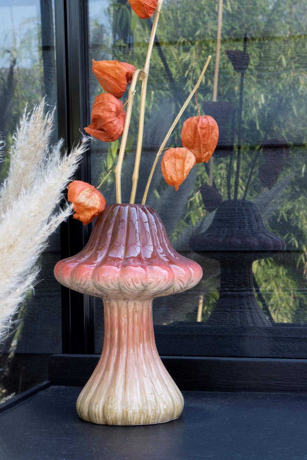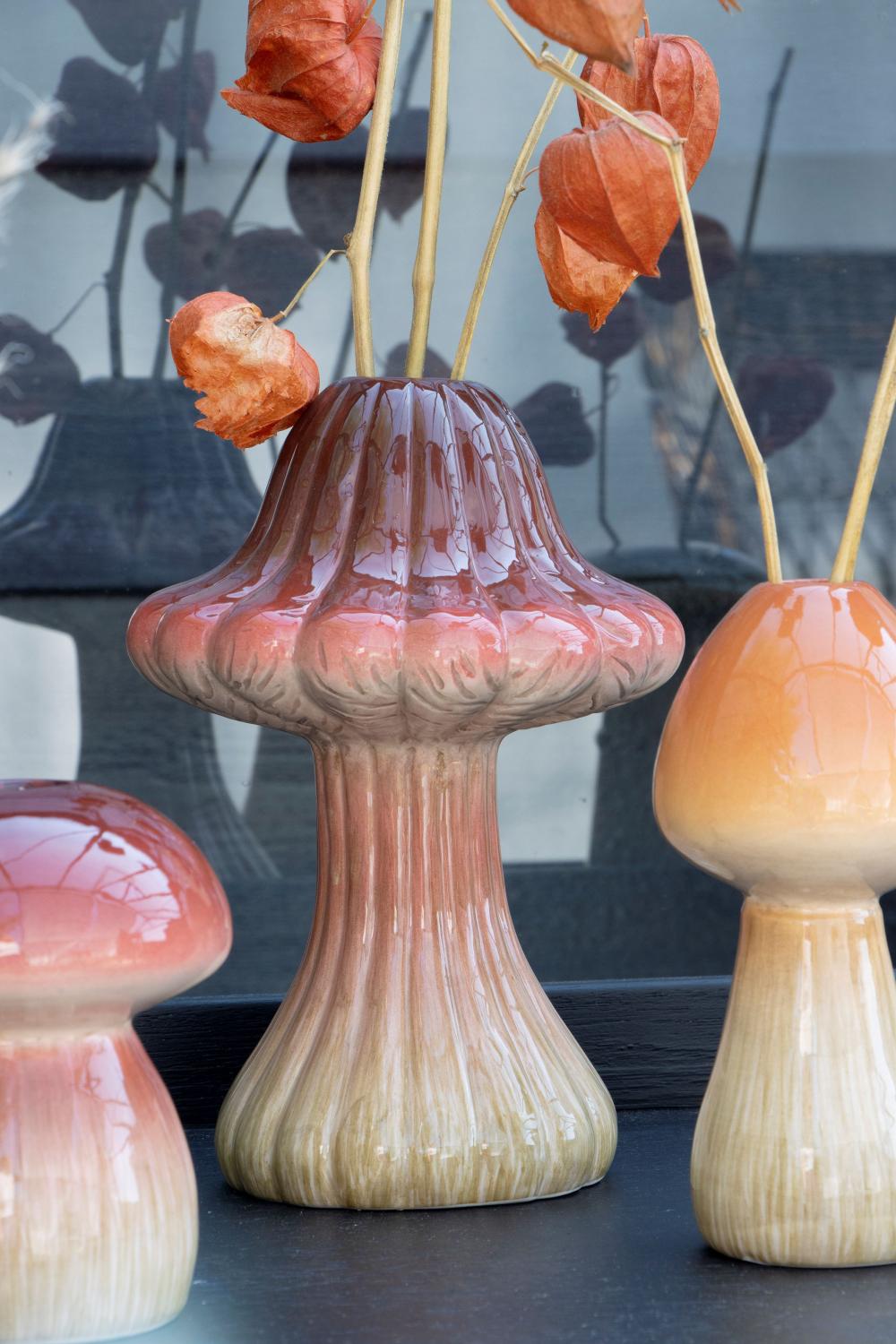 Blumenvase RICHLINDE, Fliegenpilz, Keramik, Rillen, dunkelrot-beige, 21cm, Ø15cm