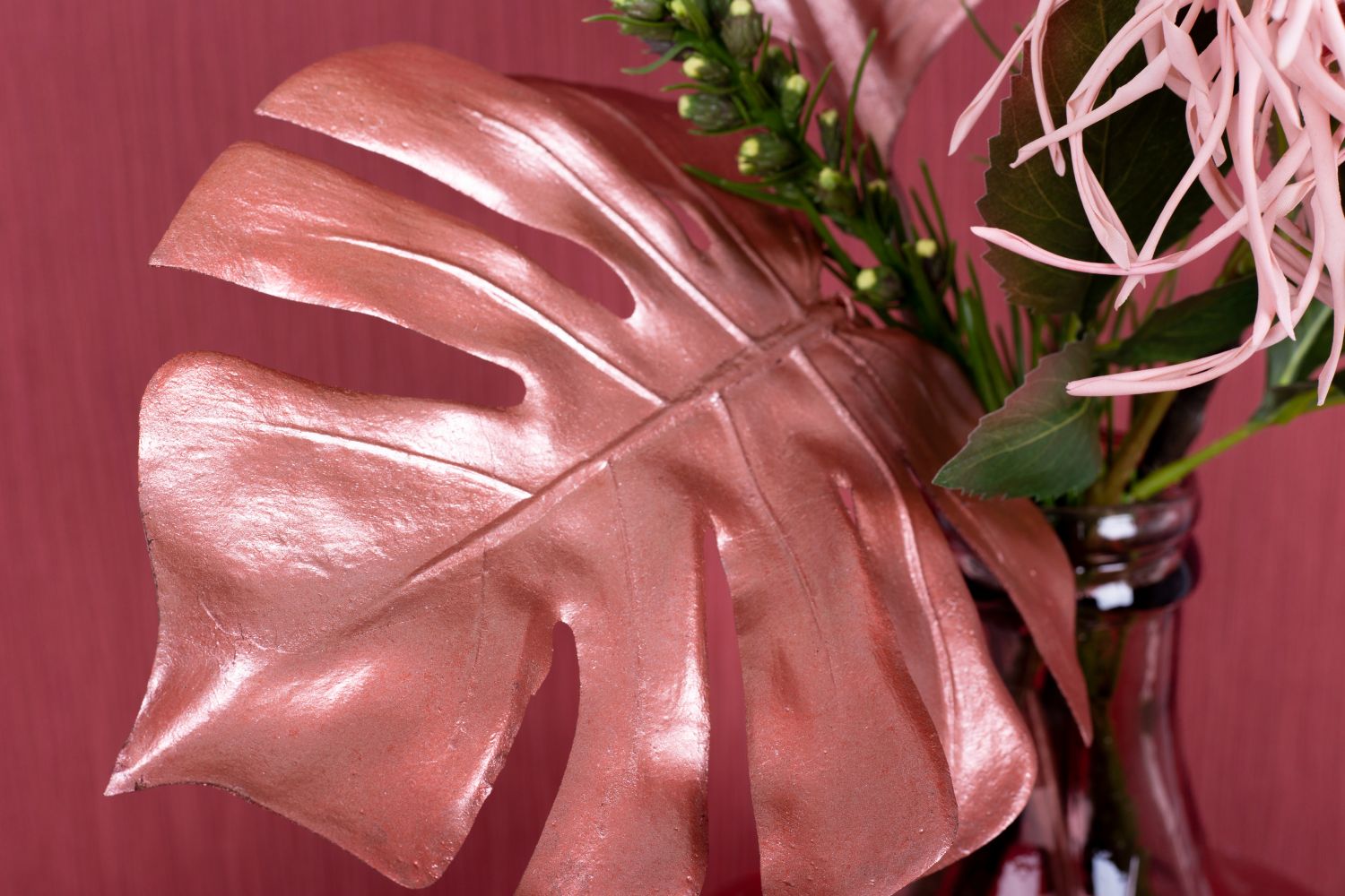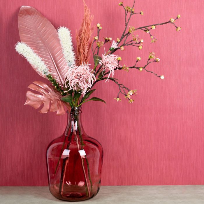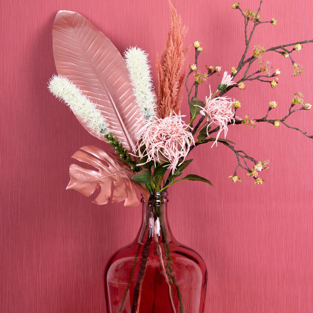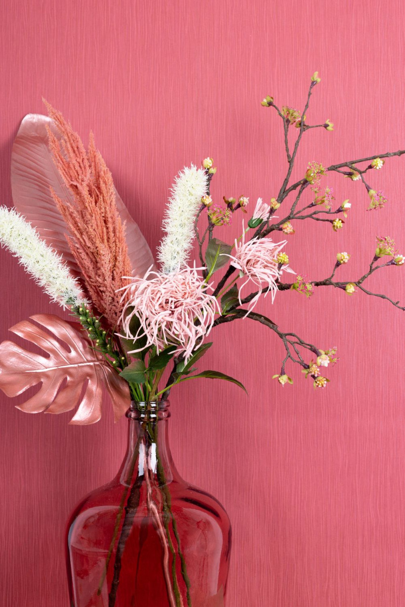 Puder und Rouge! Typische Sommerfarben liegen oft im pudrigen Bereich. Die Rougetöne harmonieren perfekt mit den metallicrosa glänzenden Blättern. Die Blüten des Ahornzweiges schimmern hinter der monochromen Gestaltung des Looks hervor und sehen in jedem Raum wirklich zauberhaft aus! Um den sehr weiblichen Look abzurunden haben wir uns für einen roséfarbenen Glasballon entschieden. Er passt einfach perfekt zum altrosafarbenen Hintergrund. Shop the Look!