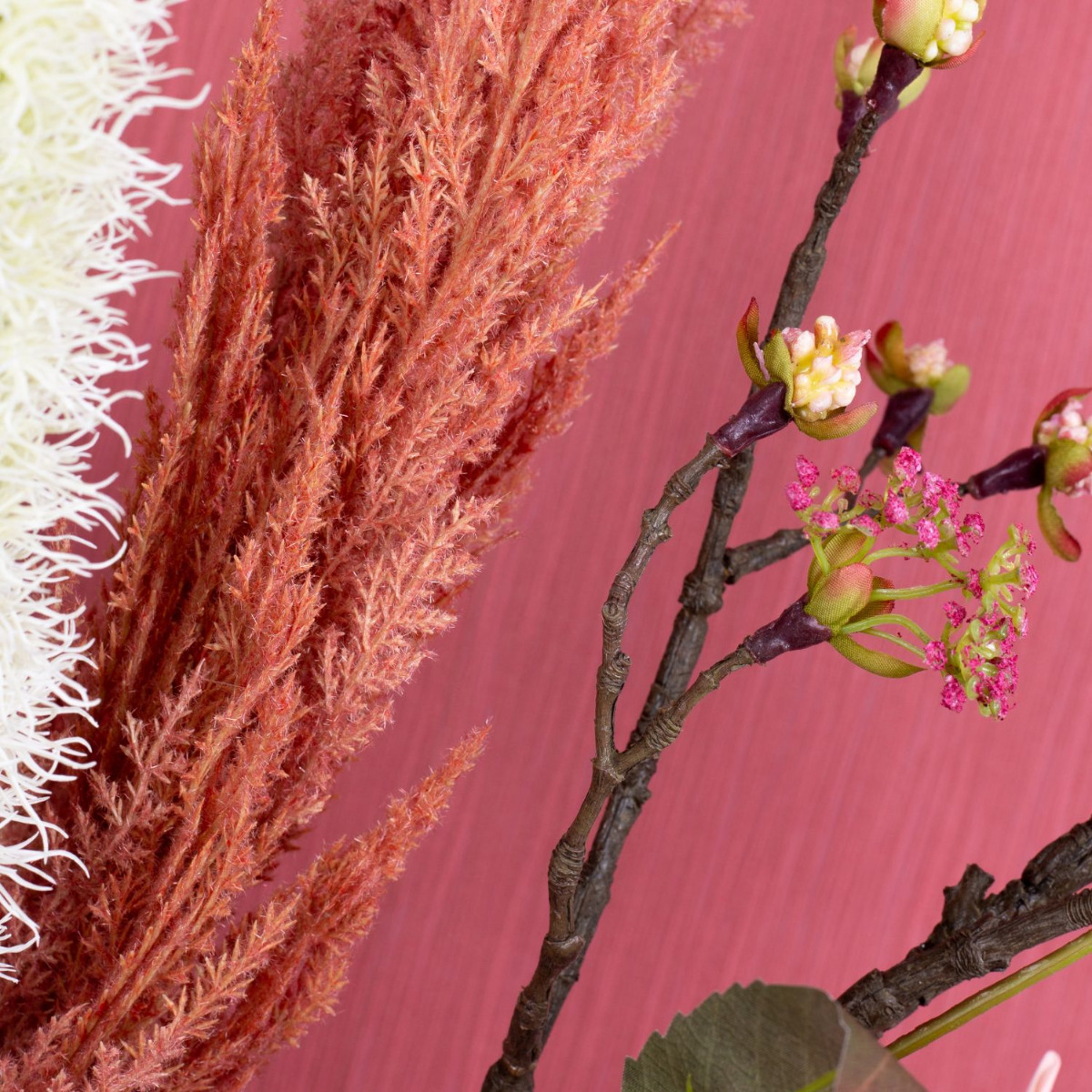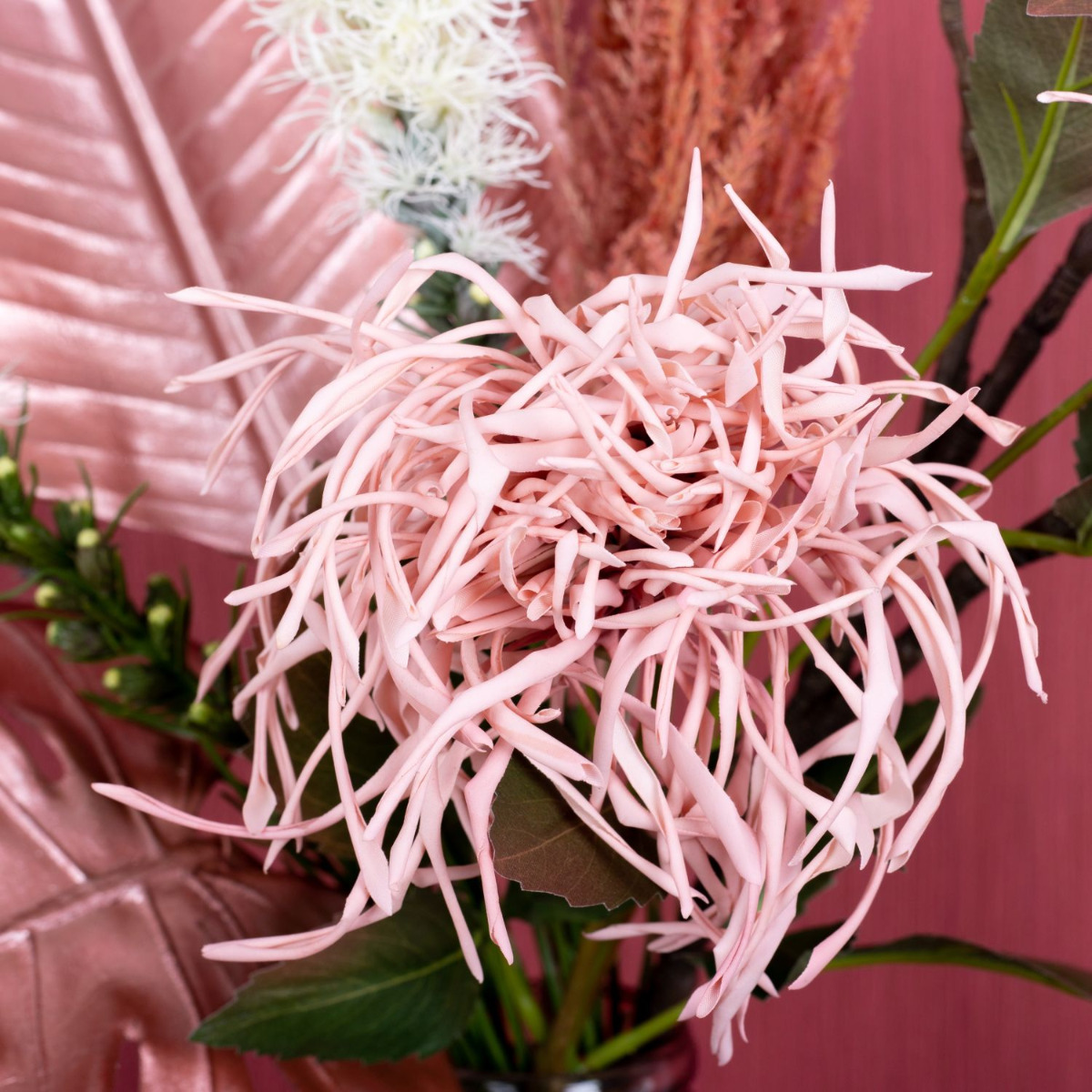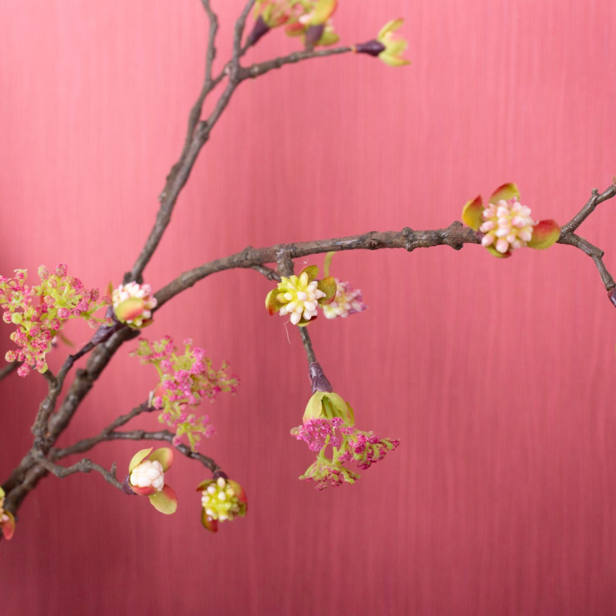 Puder und Rouge! Typische Sommerfarben liegen oft im pudrigen Bereich. Die Rougetöne harmonieren perfekt mit den metallicrosa glänzenden Blättern. Die Blüten des Ahornzweiges schimmern hinter der monochromen Gestaltung des Looks hervor und sehen in jedem Raum wirklich zauberhaft aus! Um den sehr weiblichen Look abzurunden haben wir uns für einen roséfarbenen Glasballon entschieden. Er passt einfach perfekt zum altrosafarbenen Hintergrund. Shop the Look!