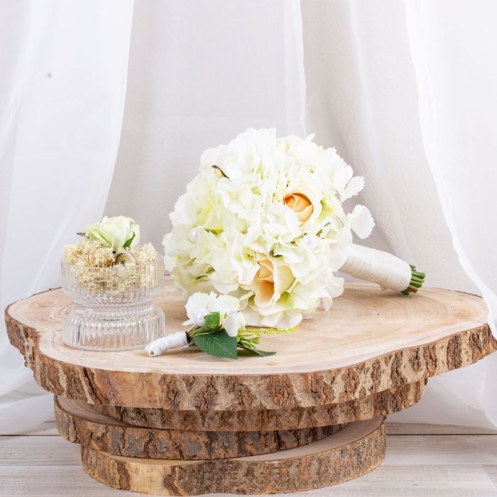 Glamorous Passion! Die zarten Rosen und die cremefarbenen Hortensien verschmelzen harmonisch miteinander und verleihen dem Strauß eine romantische Note. Die Perlen, die in den Strauß eingearbeitet sind, fügen eine subtile, aber luxuriöse Note hinzu. Sie glänzen sanft im Licht und verleihen dem Strauß einen Hauch von Glamour und Raffinesse. Passend zum Brautstrauß trägt der Bräutigam einen Anstecker, der aus einer cremefarbenen Rose, feinen Hortensienblüten, sowie einer Perle besteht. Diese koordinierten Details verbinden das Brautpaar auf subtile Weise und vervollständigen das elegante Erscheinungsbild der Hochzeitsgesellschaft. Insgesamt strahlt dieser Brautstrauß eine Aura der Romantik und der Eleganz aus, die das Herz berührt und die Augen verzaubert. Ein wahrhaft bezaubernder Begleiter für die Braut auf ihrem Weg zum Altar. Wollen auch Sie einen künstlichen Hochzeitsstrauß? Shop the Look!