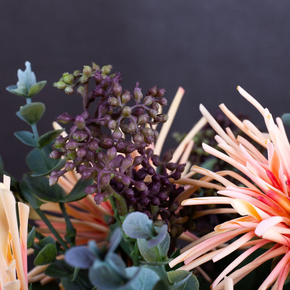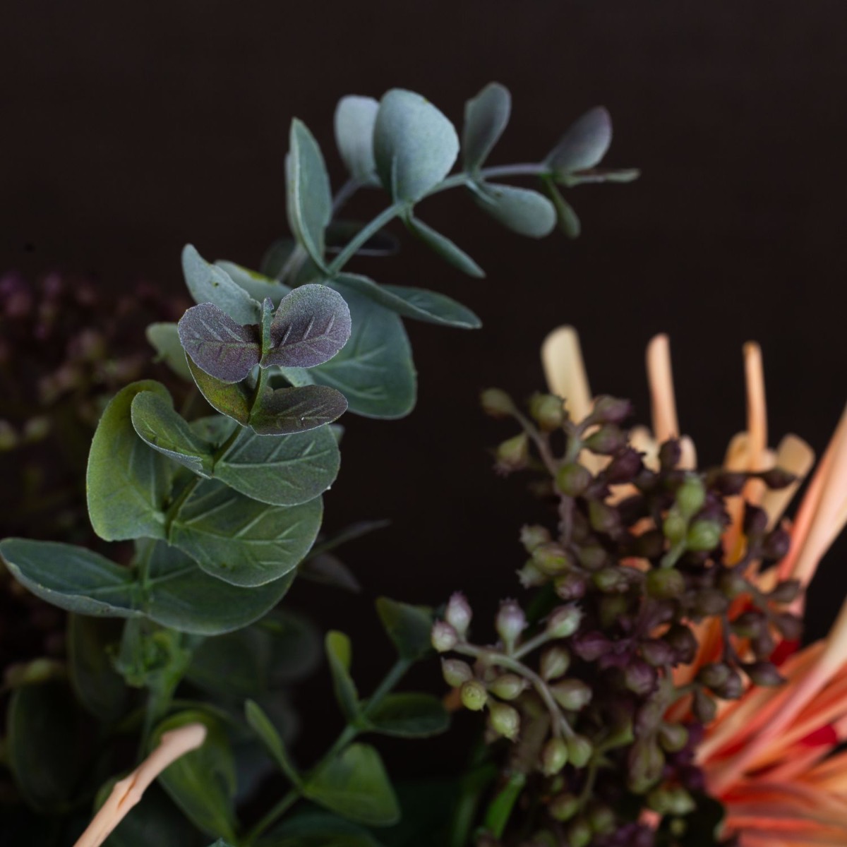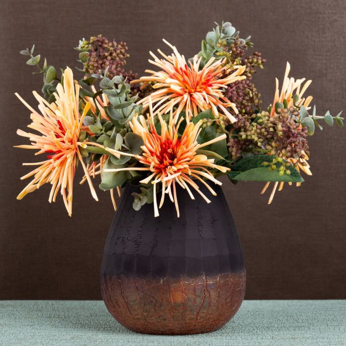 Orange und Braun! Das sind in diesem Look die markanten Farben und zeigen hier, wie gut sie zusammenpassen. Das dunkle Braun der Vase nimmt sich zurück und lässt die Farben der Chrysanthemen leuchten. Perfekt ergänzt werden die Blumen durch Lorbeerschneeball und Eukalyptus. Dieser Strauß bringt ein Strahlen in Ihr Zuhause. Shop the Look!