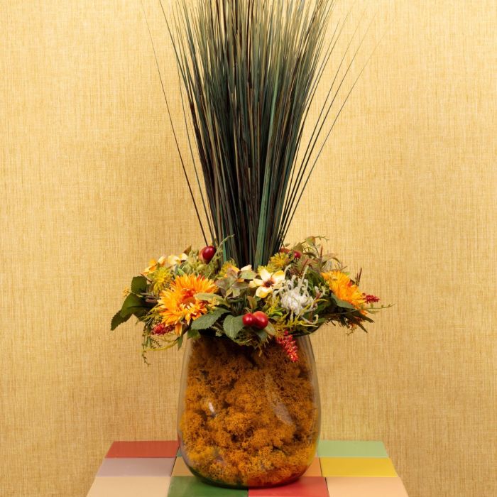 Orange und Grün! Dieser Herbstlook ist einfach gestaltet und doch sehr wirkungsvoll. Ein farbenfroher Herbstkranz, der aus typischen Herbstblumen besteht, ziert die ausgefallene Vase im Dellen-Design. In der Mitte ragt das grün-braune Fuchsschwanzgras heraus und bringt den Look zum Strahlen. Shop the Look!