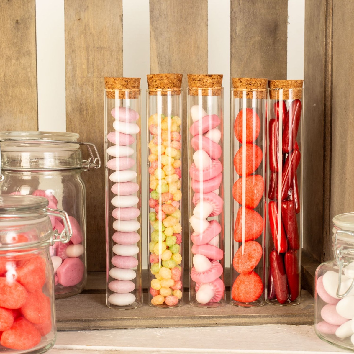 Gestaltungstipp: Die Süßigkeiten einfach auf die verschiedenen Gläser aufteilen. Die Reagenzgläser können auch als Mitbringsel für die Tischdeko verwendet werden.
