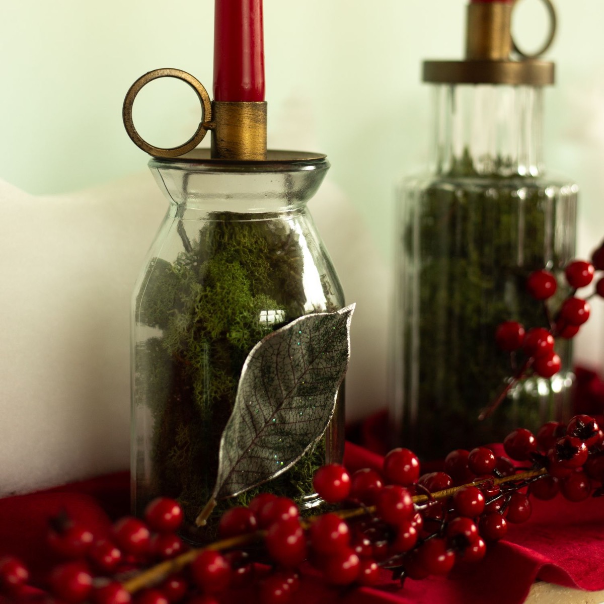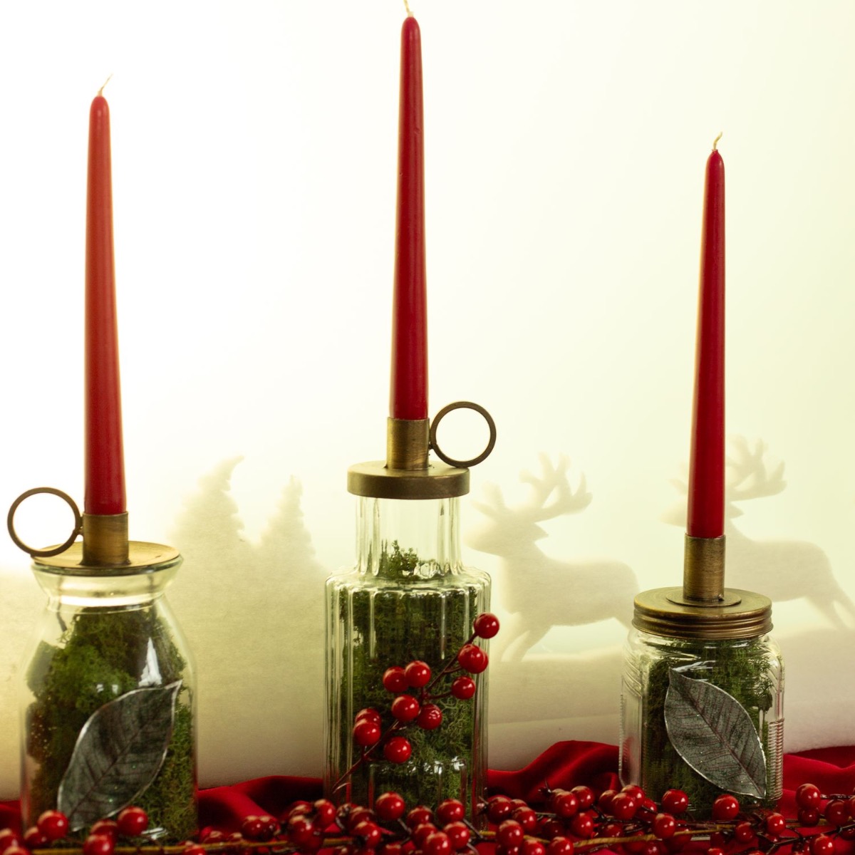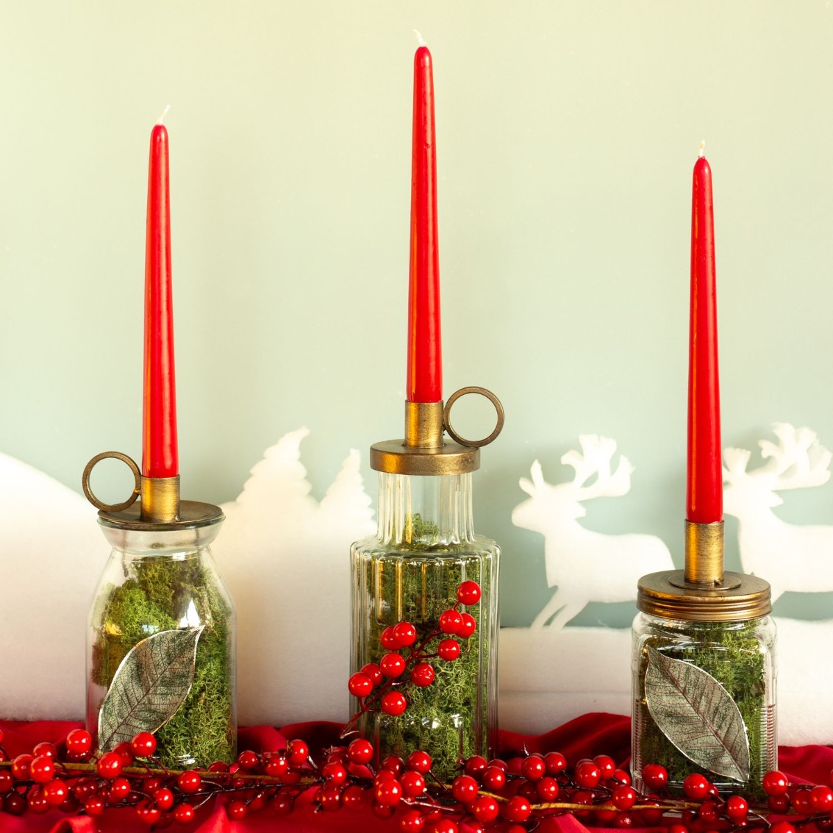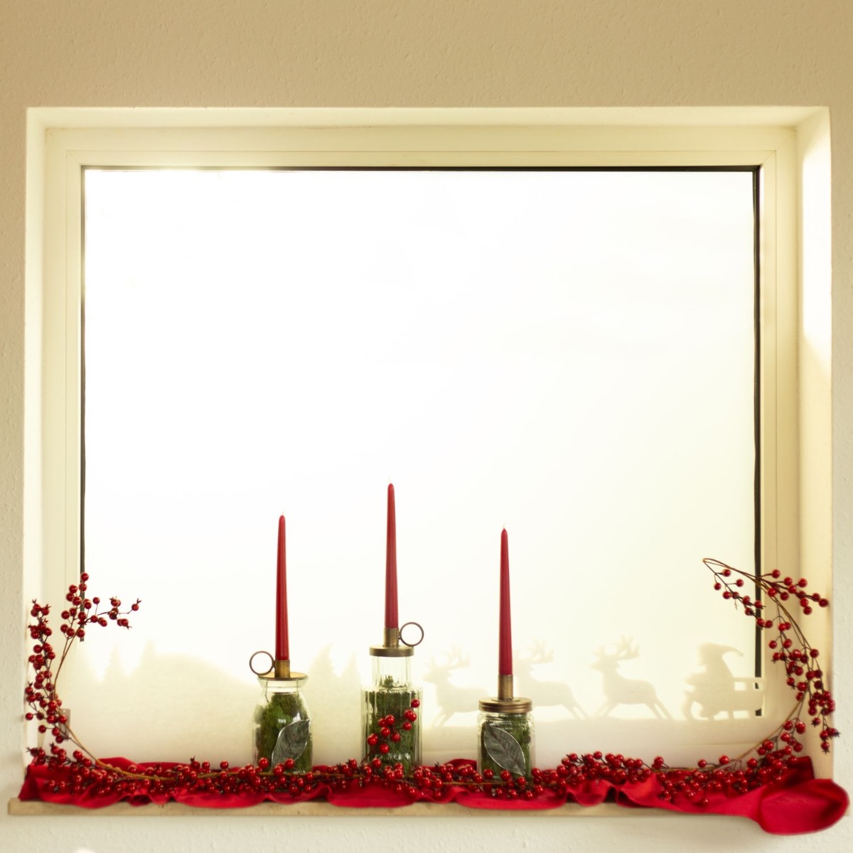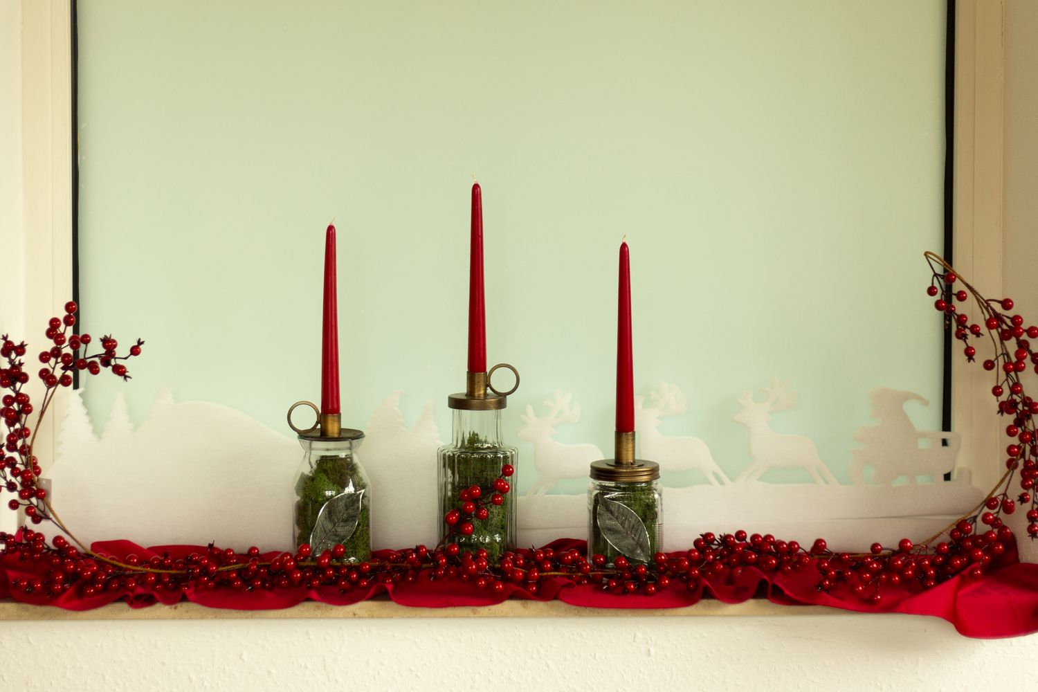 Rot, Grün und Gold! Das ist Weihnachten! Dieser Weihnachtslook ist klassisch und modern zugleich. Die Kerzenhalter, die mit grünem Naturmoos gefüllt wurden, liegen mit ihrem Vintage Design, absolut im Trend und passen richtig gut zu den roten Stabkerzen. Die rote Beerengirlande sowie die weiße Winterlandschaft im Hintergrund zaubern eine weihnachtliche Stimmung in Ihr Zuhause. Dieser Look wirkt auf einer Fensterbank besonders gut, weil das Licht, das von außen hereinkommt, die Winterlandschaft zum Leuchten bringt. Shop the Look!
