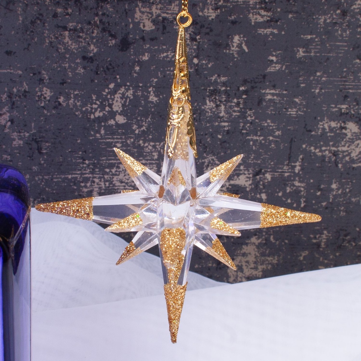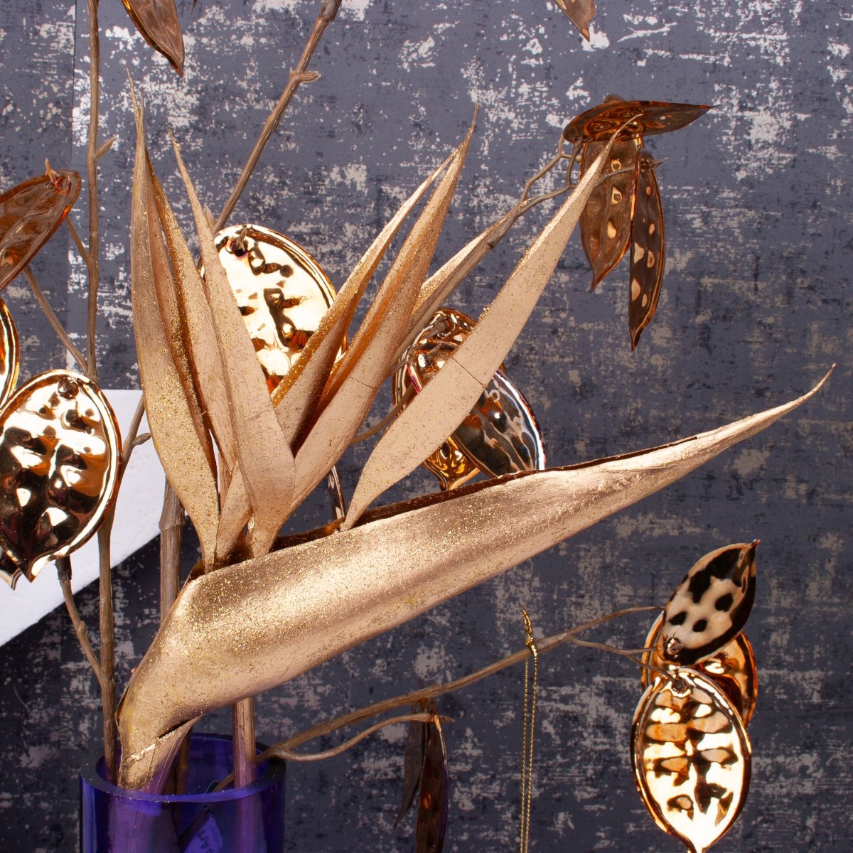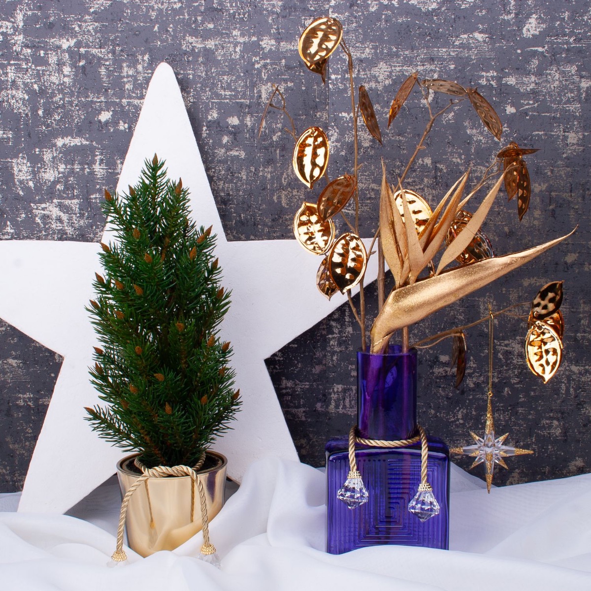 Violett und Gold! Eine Farbkombination mit königlicher Ausstrahlung. Die violette Vase aus der Serie ORESTINO wurde in diesem Look mit goldenen Kunstpflanzen dekoriert. Selbst tropische Pflanzen, wie die goldene Strelitzie wirken hier richtig weihnachtlich. Unsere Acrylkugeln an einer goldenen Kordel wurden hier, wie ein Schal um die Vase gewickelt. Ein zartes Weihnachtsbäumchen, das vor einem Styroporstern platziert wurde runden den weihnachtlichen Look perfekt ab. Shop the Look!