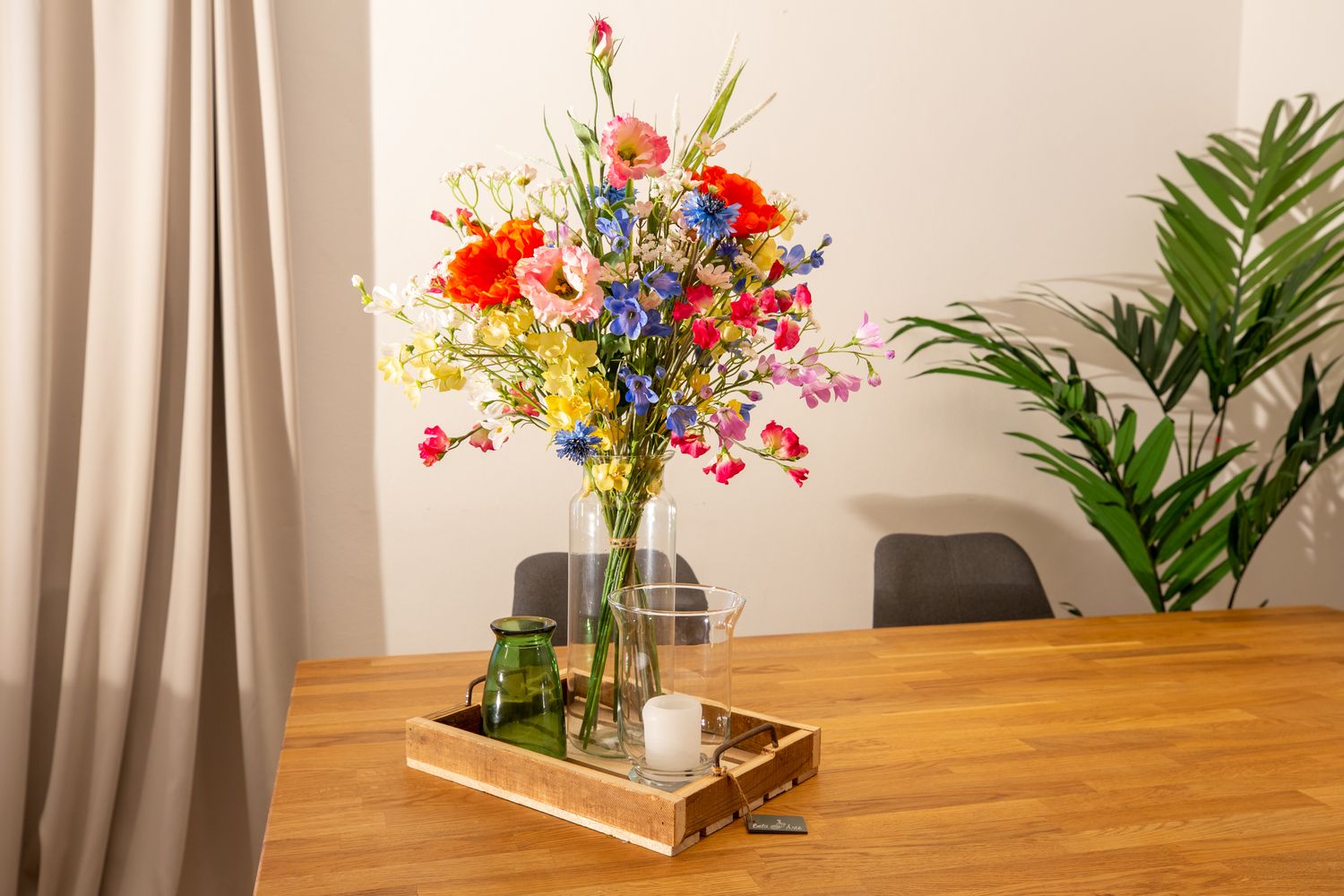 Bunte Farben machen gute Laune! Und das tut dieser Strauß hier besonders, denn er ist unser Bestseller und erfreut schon einige Wohnzimmer unserer Kunden. Ein Grund mehr daraus mal einen Look zu zaubern. Das kleine Holztablett eignet sich perfekt als Basis für eine Zimmerdeko. Dazu passend haben wir ein Windlicht mit Stumpenkerze ausgewählt und eine kleinere, grüne Vase als Eyecatcher dazugestellt. So leicht können Sie Farbe in Ihr Zuhause bringen. Shop the Look!