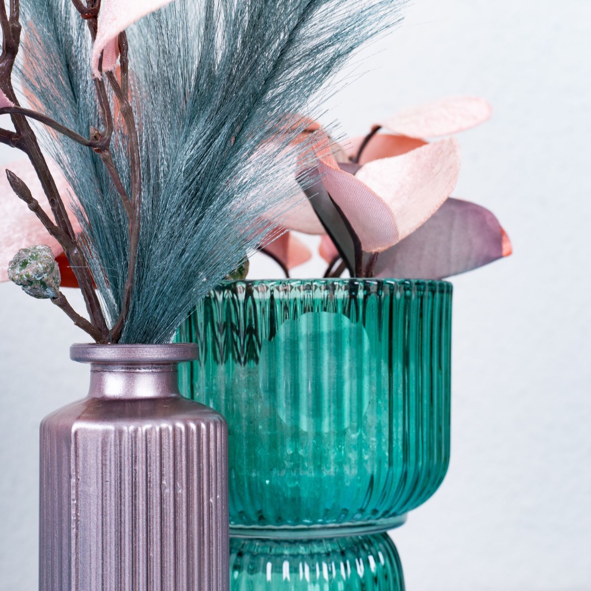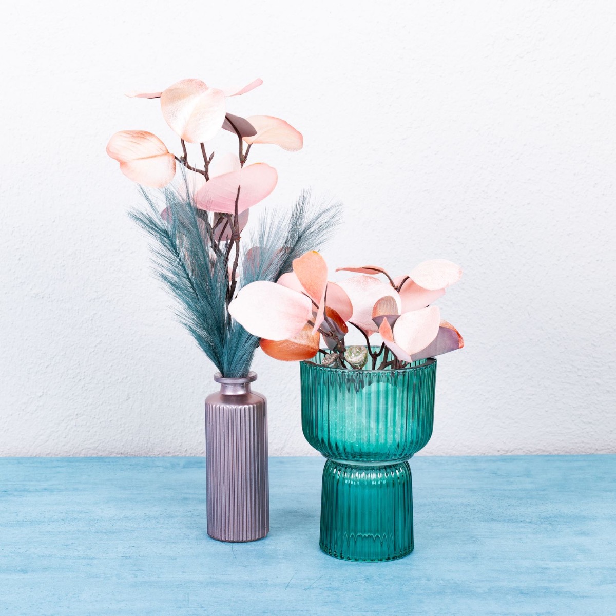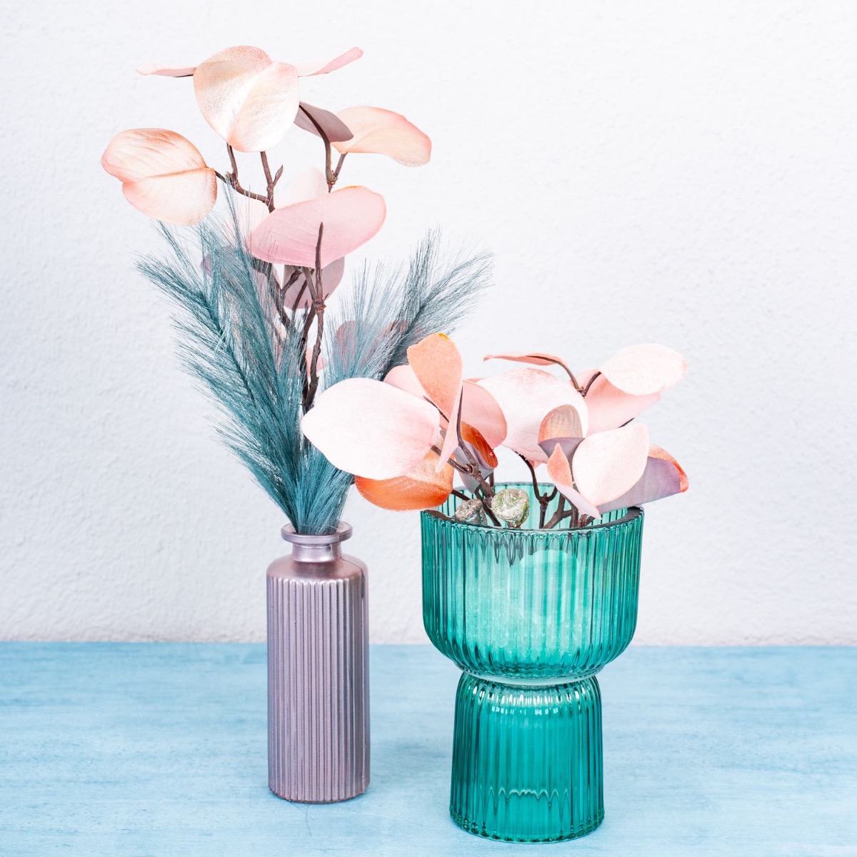 Eisiges Blau und erfrischendes Rosé! Kühle Farben können auch ein warmes Gefühl erzeugen. Der samtige Eukalyptuszweig wurde hier mit einem Federgras in einem kühlen Blau kombiniert. Heraus kommt ein romantisch und gleichzeitig kühl wirkender Look. Die kleine Flasche aus der Serie EMANUELA passt super zu der Rillenstruktur des doppelseitig nutzbaren Kerzenglases aus der Serie KENSIE welches von uns zur kleinen Vase umfunktioniert wurde. Mit Kunstblumen ist einfach alles möglich! Shop the Look!