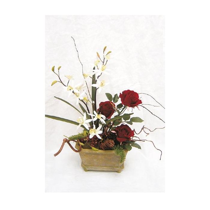 - Mit Rosen, Dendrobium Orchidee, Korkenzieherweide, Tanne, Zapfen und Beeren
