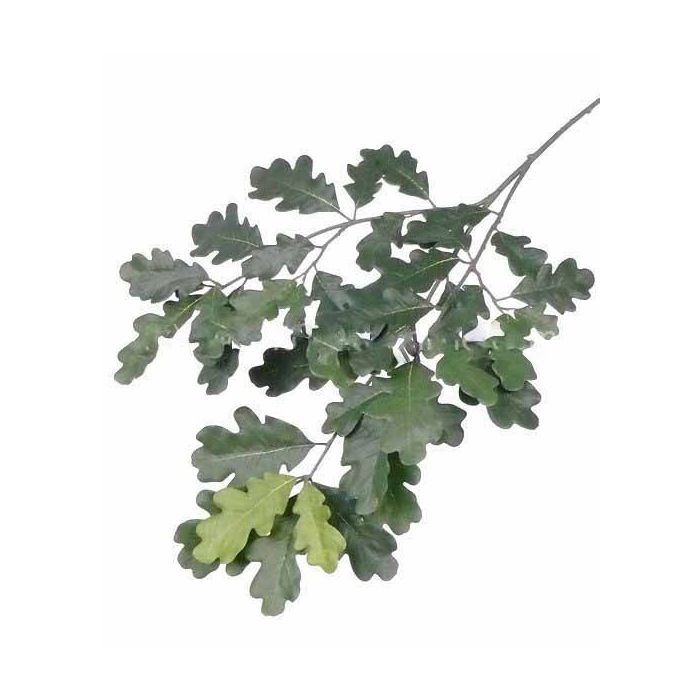 Künstlicher Eichenblattzweig in der klassischen Blattfarbe grün. Der Zweig hat eine Gesamtlänge von ca. 70 cm und ist werkseitig schwer entflammbar ausgerüstet. Ideal für individuelle Baum-Dekorationen im Bühnen-, Theater- und Showbereich.