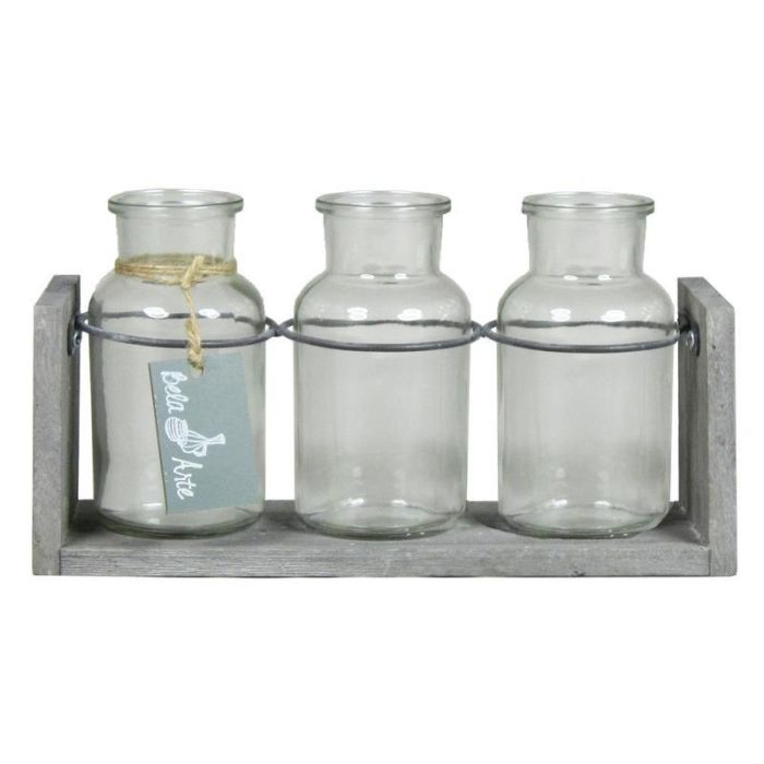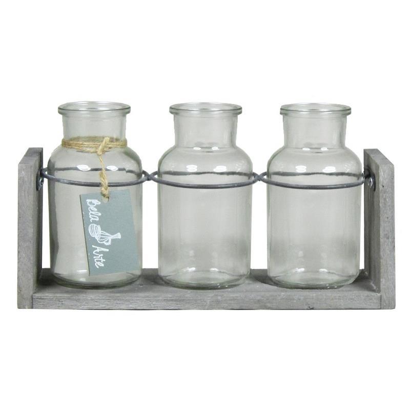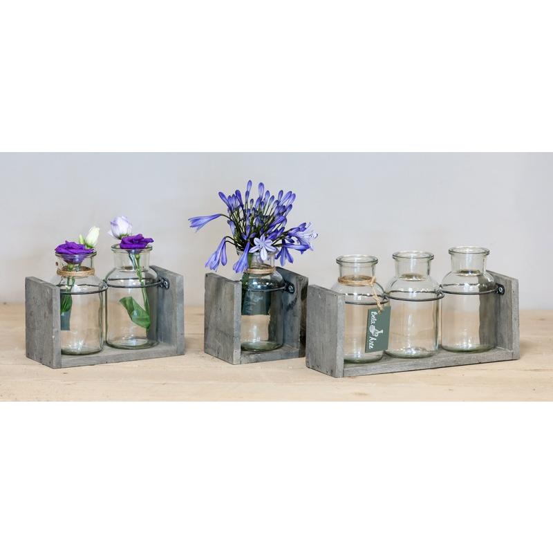 Deko Flaschen LORRIE, Glas, mit Holzständer, 3 Gläser, klar, 25x8x13cm