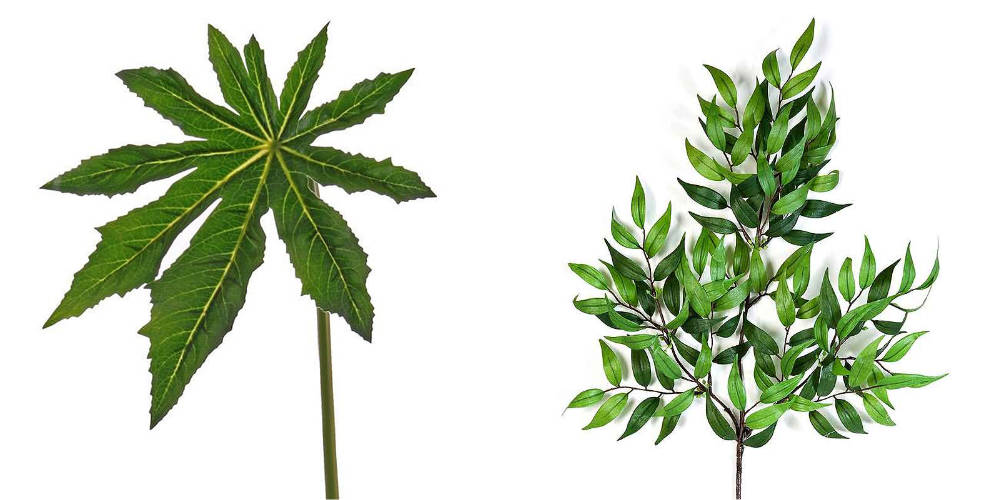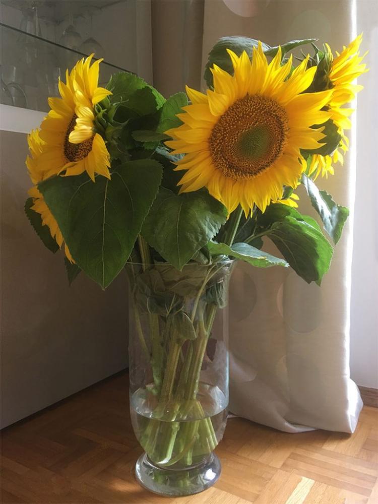 Eigentlich reichen schon drei große Kunst-Sonnenblumen mit ihren Blättern aus, um einen schönen Strauß zu erhalten. In einer unserer Bodenvasen von INNA-Glas kommen sie dabei besonders gut zur Geltung. Falls euch das aber zu wenig grün ist, eignen sich mehrere große. künstliche Zierblätter, die ihr einfach von außen unter die Sonnenblumen legt.