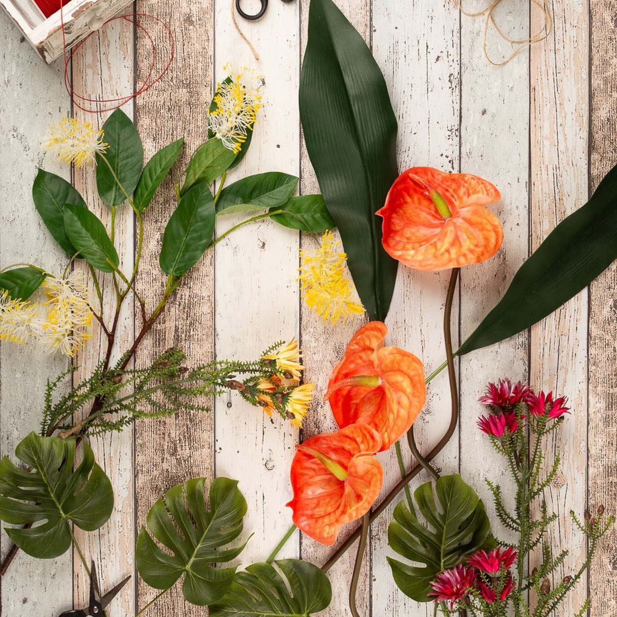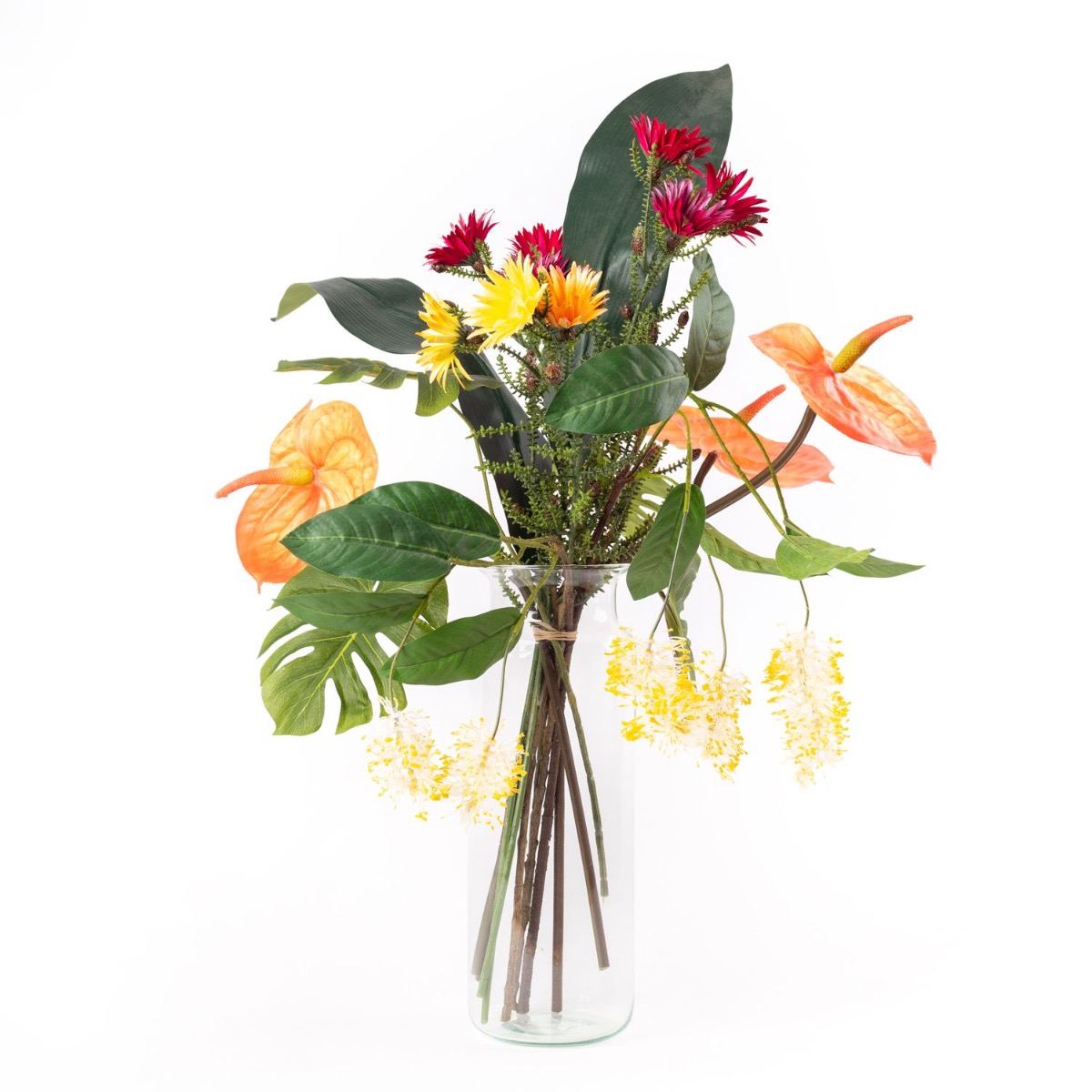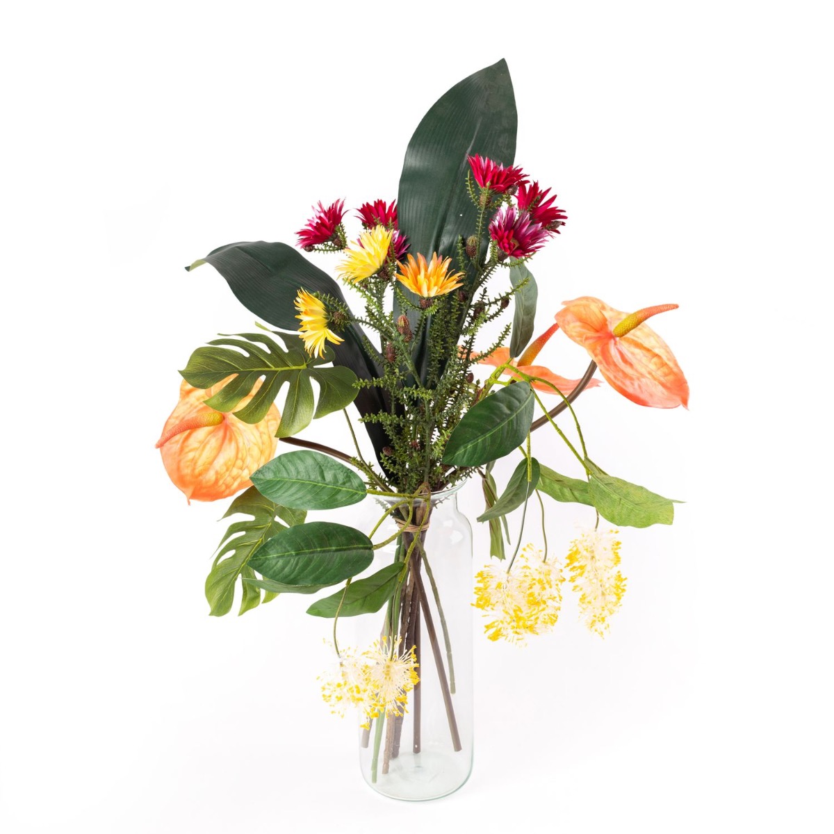 Dieser Strauß AVALU verkörpert wahre Lebensfreude. Die Farben Gelb, Orange und Pink stehen für Positivität, Fröhlichkeit und Kreativität. Die ausgefallenen Blüten scheinen direkt aus dem Regenwald Australiens für diesen Strauß gepflückt worden zu sein. Kap-Strohblumen, australische Silbereiche und Flamingoblumen umspielen die tropischen Blätter und bringen ein Leuchten in Ihr zu Hause. Diesen Strauß muss man einfach haben!