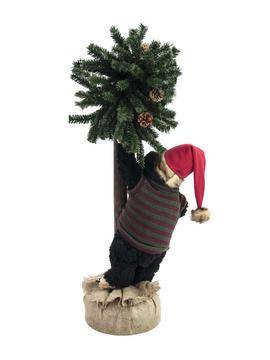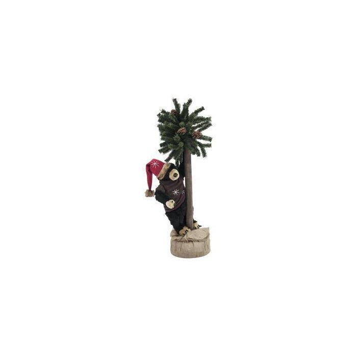 Der braune Plüschbär JOEL trägt eine klassische rotweiße Nikolausmütze und hält sich an einem grünen Tannenbaum fest. Der schöne Braunbär schmückt in Kombination mit der Tanne z.B. Wintergärten und Eingänge von Thermen und Gaststuben.