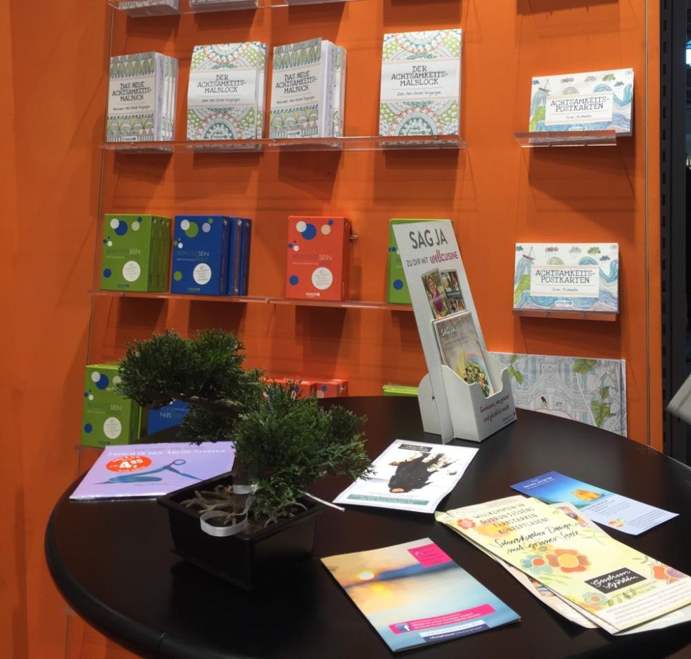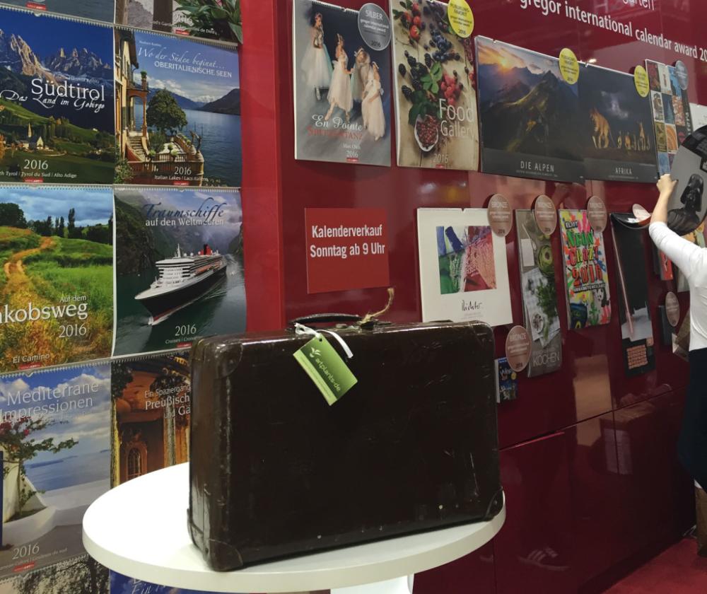 Doch wir wollen ja nicht nur rumsitzen, sonder auch noch mehr von der Buchmesse sehen. Mit unserem künstlichen Bonsai haben wir mal einem Stand, der förmlich „Entspannung“ schrie, vorbei geschaut. Hier gab es Anti-Stress Ausmalbücher und unser kleine Zeder fühlte sich hier wie zu Hause in einem Zen-Garten. Um eine kleine Weltreise zu machen, ohne uns viel bewegen zu müssen haben wir uns Kalender aus aller Herren Länder angeschaut.