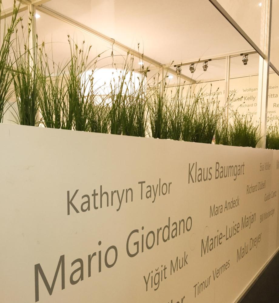 Dieser gehörte zum Bastei Lübbe Verlag und an ihm hingen Fotos vieler Autoren. Aber das war natürlich nicht die einzige künstliche Pflanze auf der Messe. Vorhin auf dem Lesetisch haben wir ja bereits schon eine Kunstrose gesehen, zu der sich unsere Mini-Orchidee gesellen durfte. Auch die „Autorenwand“, die einen Bereich umsäumte war künstlich begrünt. Dort wucherten nämlich Kunstgräser um der Wand etwas Farbe zu geben. Hätten wir uns auf die Agora getraut, hätten wir vielleicht noch die echten Verwandten gesehen, aber es war so drinnen viel schöner.