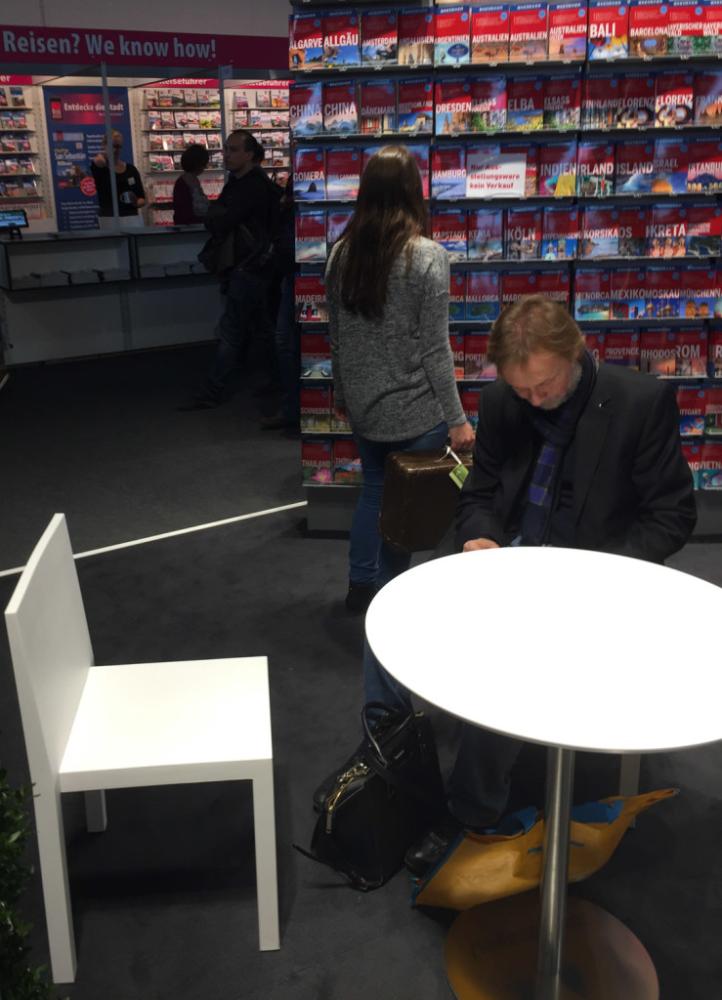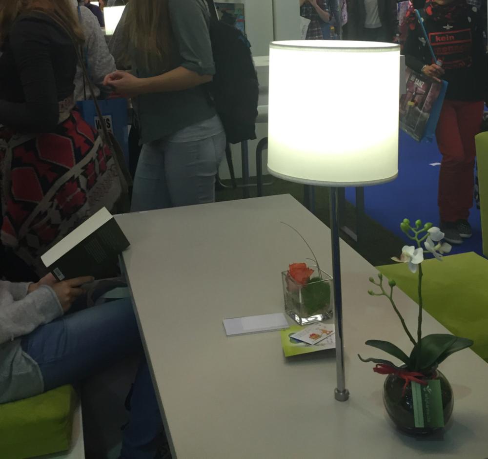 Von diesem Schreck mussten wir uns erstmal ein bisschen erholen. Und wie könnte man das besser, als beim Lesen? Und wo könnte man besser Lesen, als auf einer Buchmesse? Um den Tisch gleich noch gemütlicher zu gestallten, haben wir unsere Orchidee mit auf den Tisch gestellt. Passt perfekt zu den grünen Sesseln und dem weißen Lampenschirm.