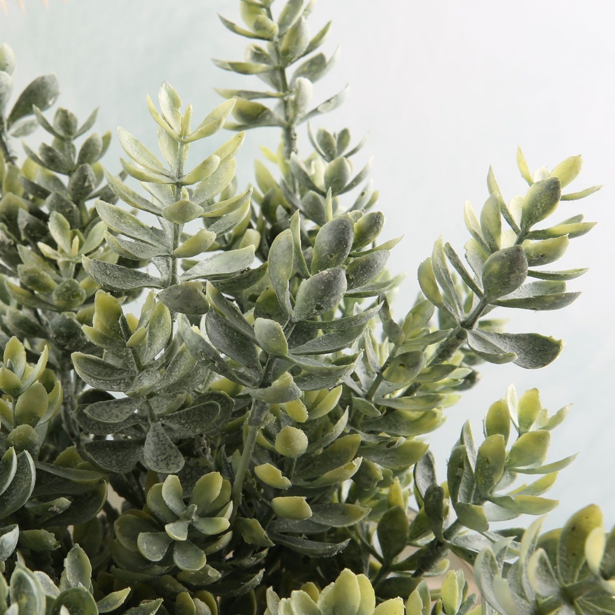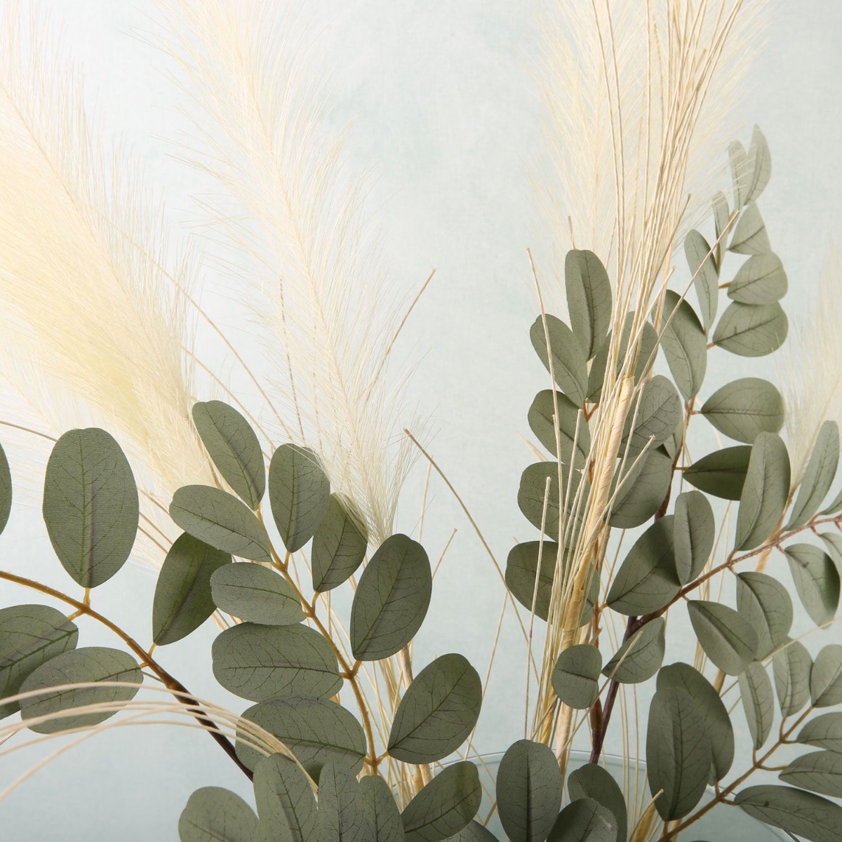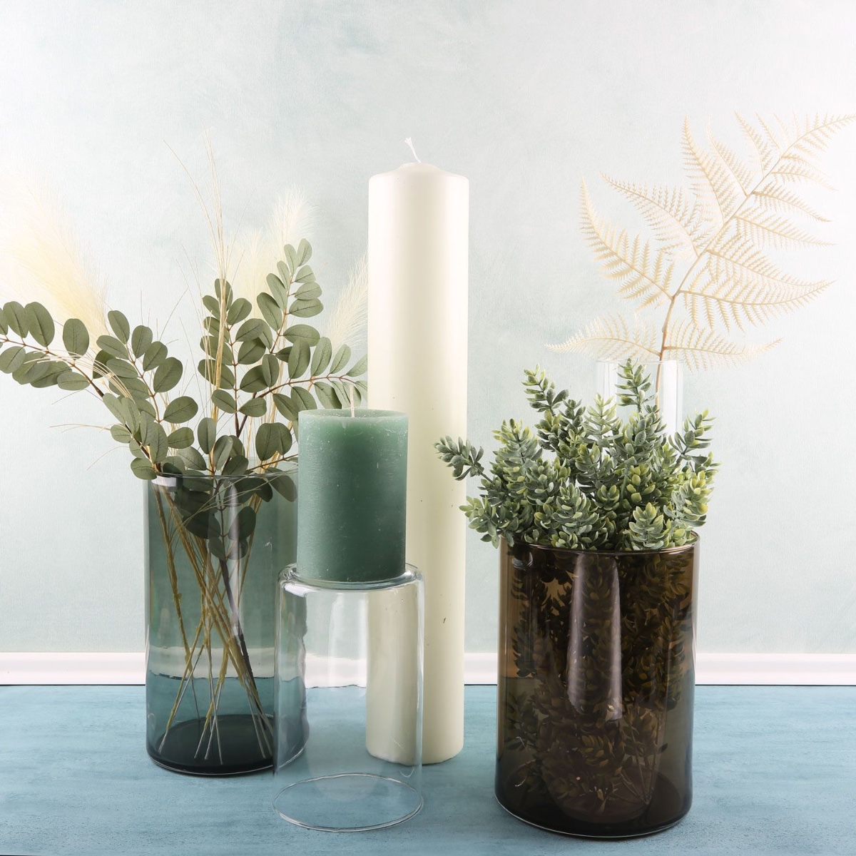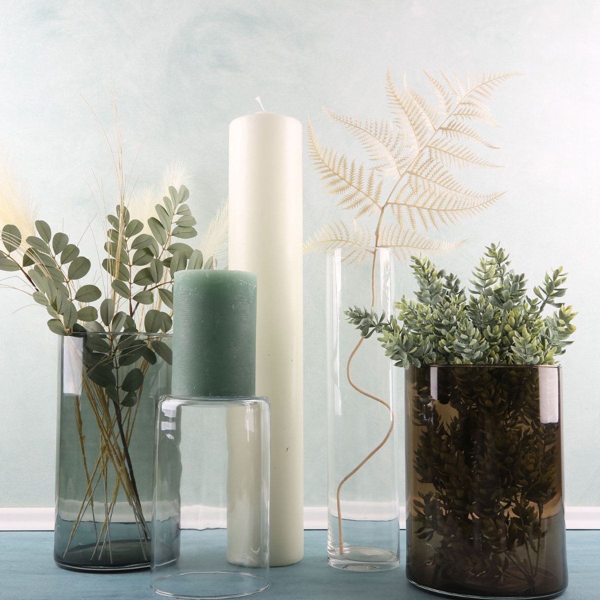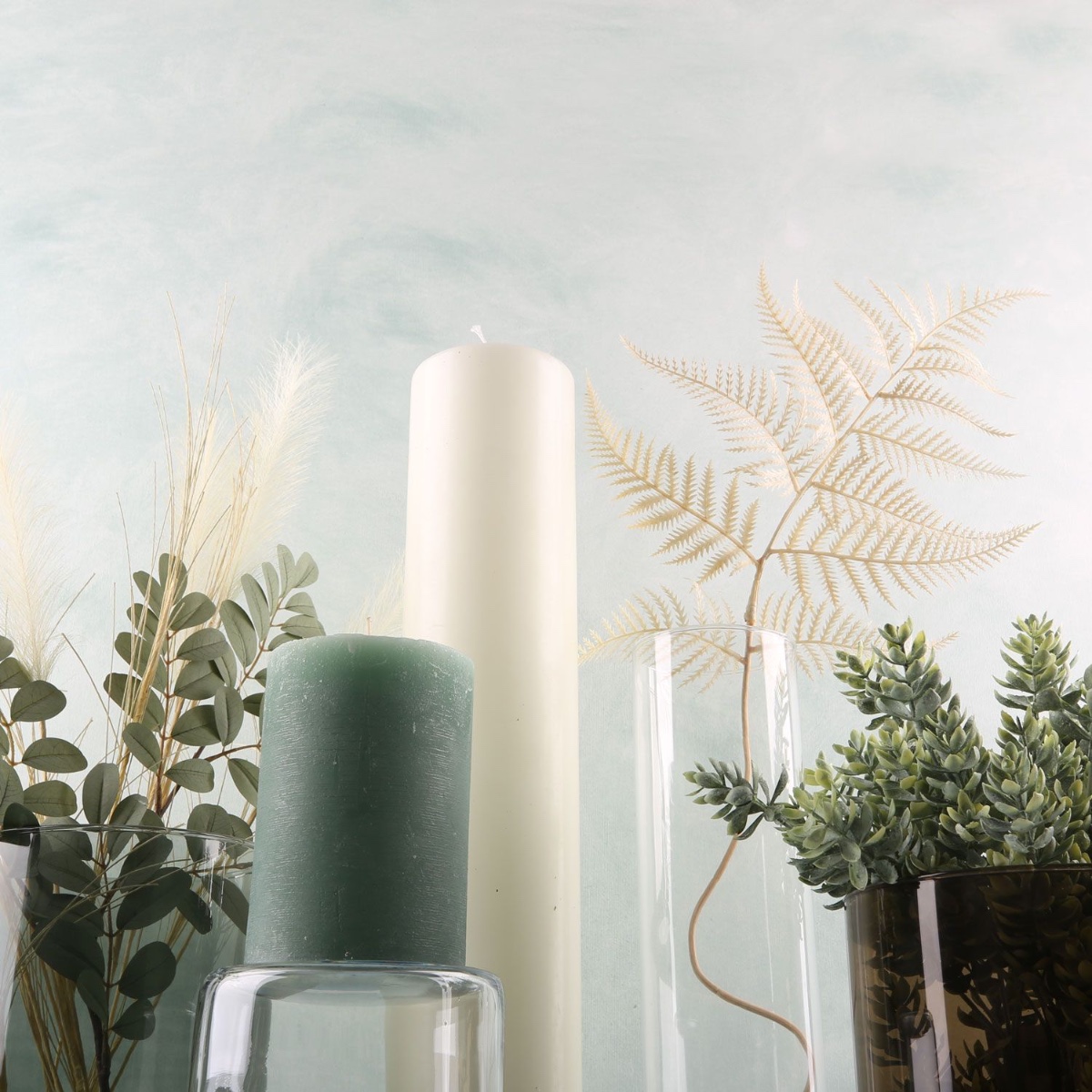 Eukalyptusgrün und Offwhite! Eine elegante Ganzjahresdeko bietet dieser Look für Freunde von klassischen Designs. Eine Sammlung aus Sanya-Vasen in verschiedenen Höhen und Farben ist hier die Basis des Looks. Der Clou, stellt man eine Vase auf den Kopf, so hat man einen Kerzenständer. So erreicht die kleine Kerze in der Trendfarbe Mintgrün die Höhe unserer riesigen Bodenkerze. Der cremefarbene Farnwedel passt farblich einfach super zu den zarten Federgräsern und den grau-grünen Zweigen. Ob Sommer oder Winter, diese Deko passt immer. Shop the Look!