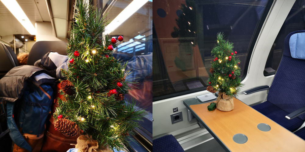 Weiter ging meine Reise dann mit der Bahn. Hier habe wir es uns gemütlich gemacht mit Lebkuchen und Spekulatius. Die Leute haben ganz schön doof geschaut, als ich meine Lichterkette angemacht hab. Die haben wohl noch nie einen Bahn-fahrenden künstlichen Tannenbaum gesehen.