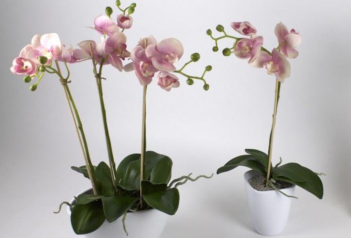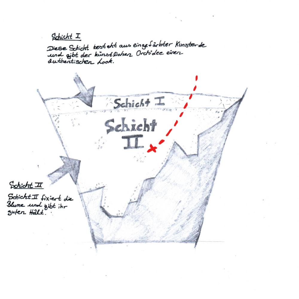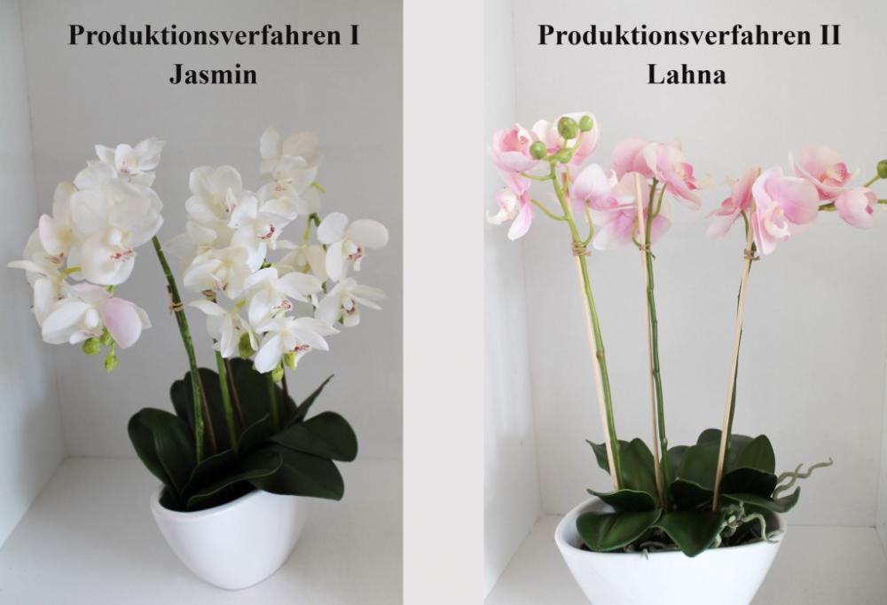 links: Stellvertretend für dieses Produktionsverfahren, möchten wir unsere Orchidee JASMIN im weißen Keramik Töpfchen genauer untersuchen. JASMIN hat schon eine lange Reise hinter sich. Ihre Produktionsstätte liegt in China und wird von dort, bereits fertig im Topf, zu uns verschifft. rechts: Auch unsere neue Orchidee LAHNA musste reisen, jedoch in ihren Einzelteilen wie Blätter, Blüten und Zweige. In Europa angekommen, lernt sie dann ihre europäischen Freunde kennen. Hier wird sie nämlich mit dem Granulat im Keramiktöpfchen vereint.