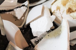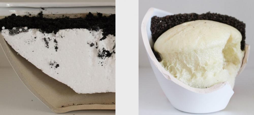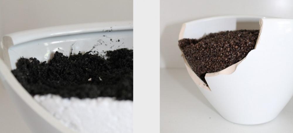 links: Unter der schwarzen Erde können wir JASMIN`s „Wurzeln“ sehen. Hier hat man sich für Styropor entschieden, welches zurecht geschnitten wurde und danach in den Keramik Topf eingeklebt wird. Nach dem einkleben können die künstlichen Einzelteile gleich gesteckt werden. Das schneiden von Styropor beansprucht jedoch Zeit, muss jedem Keramiktöpfchen angepasst werden und verusacht leider viel Abfall. rechts: Hier wird nun eine neue Entwicklung eingesetzt. Die Keramik Schale wird mit Bauschaum befüllt. Dies geschieht in wenigen Sekunden und der Topf ist optimal ausgefüllt. Dadurch werden die Pflanzenzweige noch besser fixiert. Auch wenn die Steckblumen besseren Halt finden, so gibt es hier einen kleinen Nachteil, denn der Bauschaum muss erstmal eine Weile trocknen bevor er weiter verarbeitet werden kann.