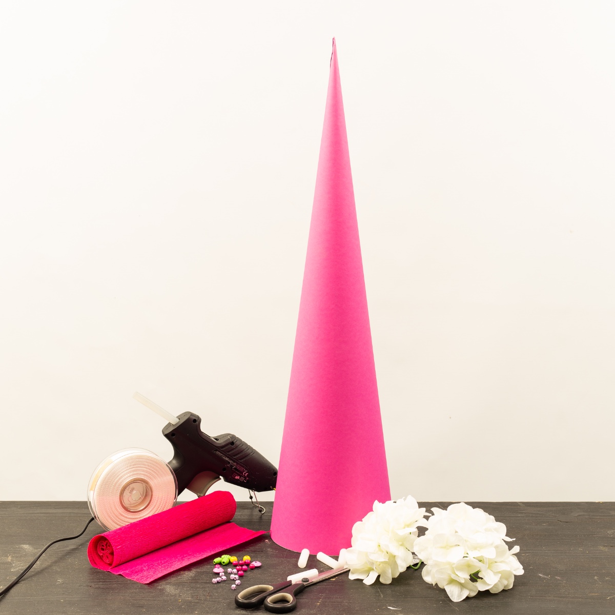 Zusätzlich benötigtes Material: ein Rohling Schultüte, Flüssigkleber, Krepppapier und Holzperlen