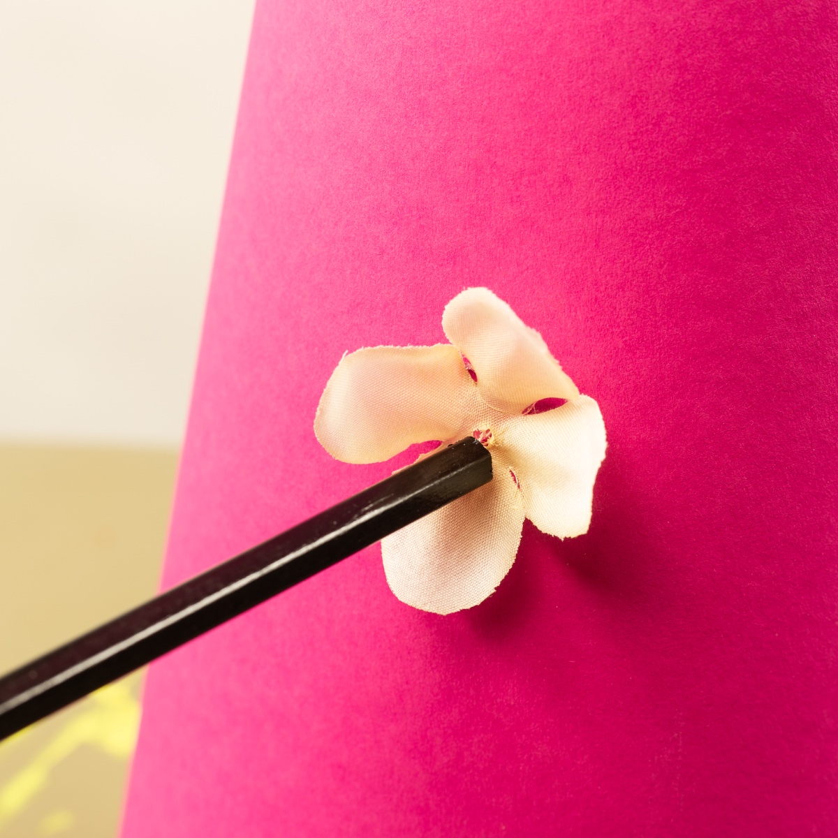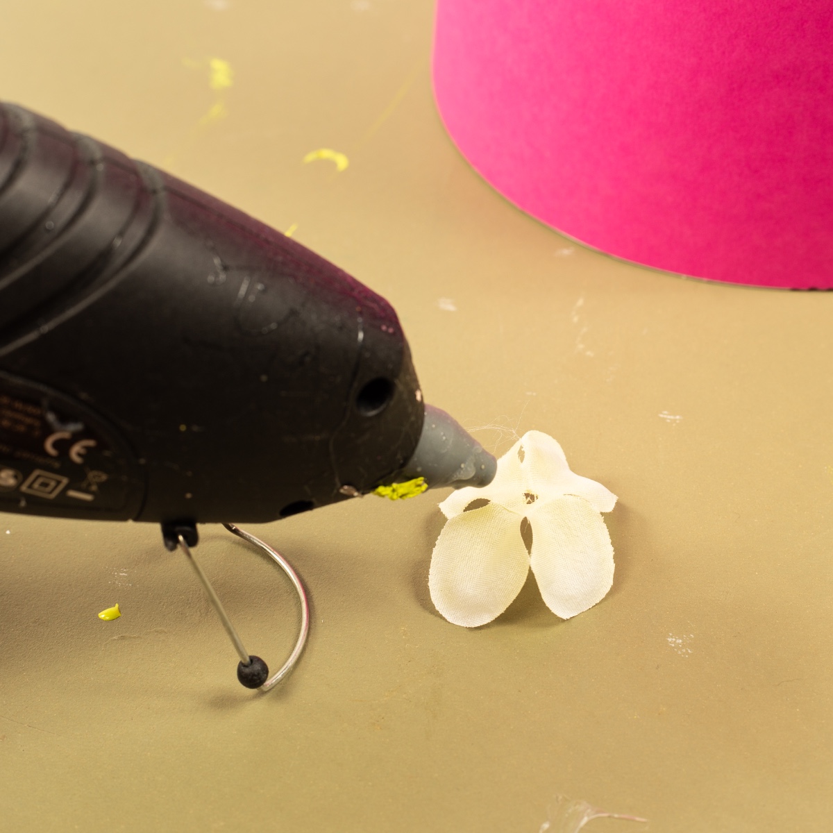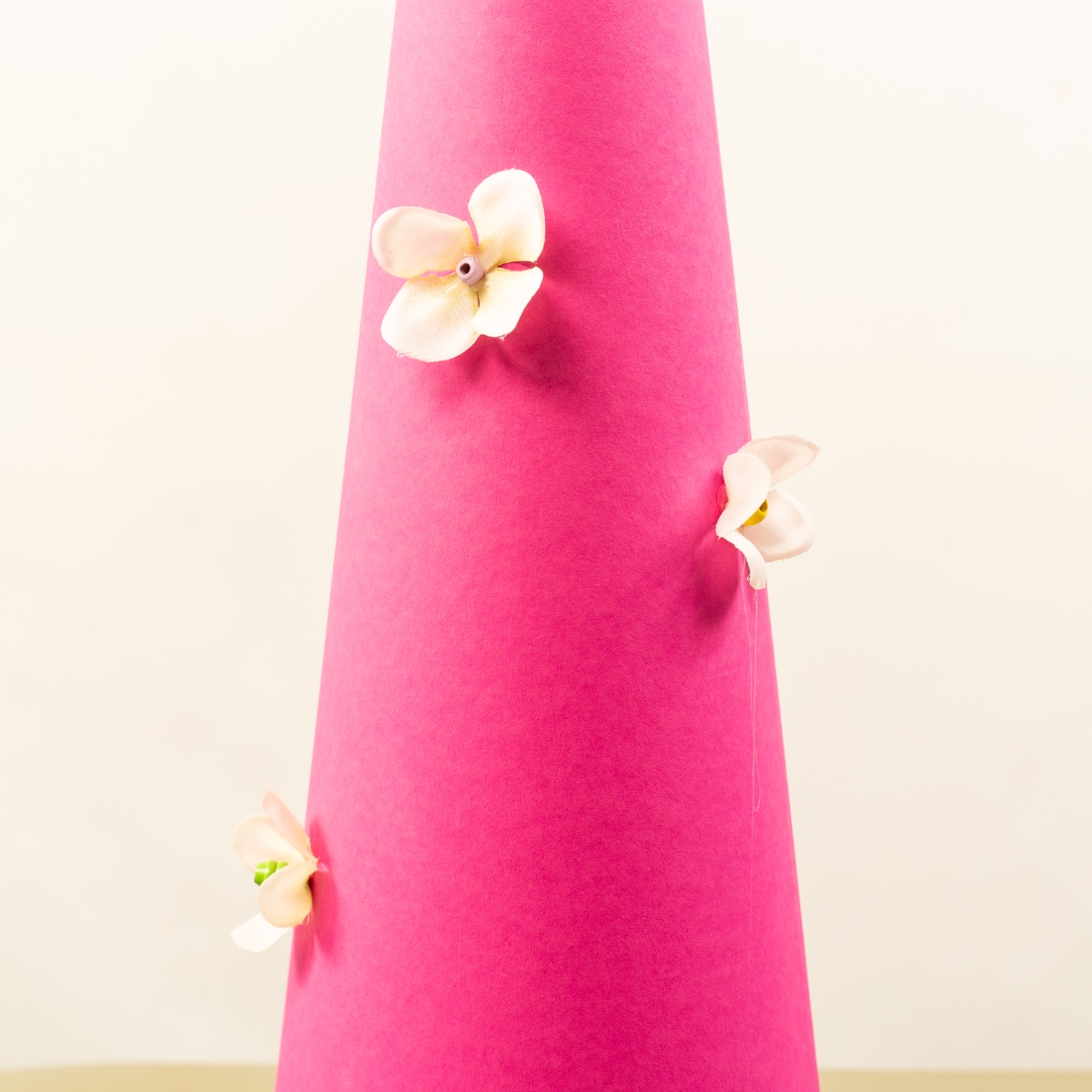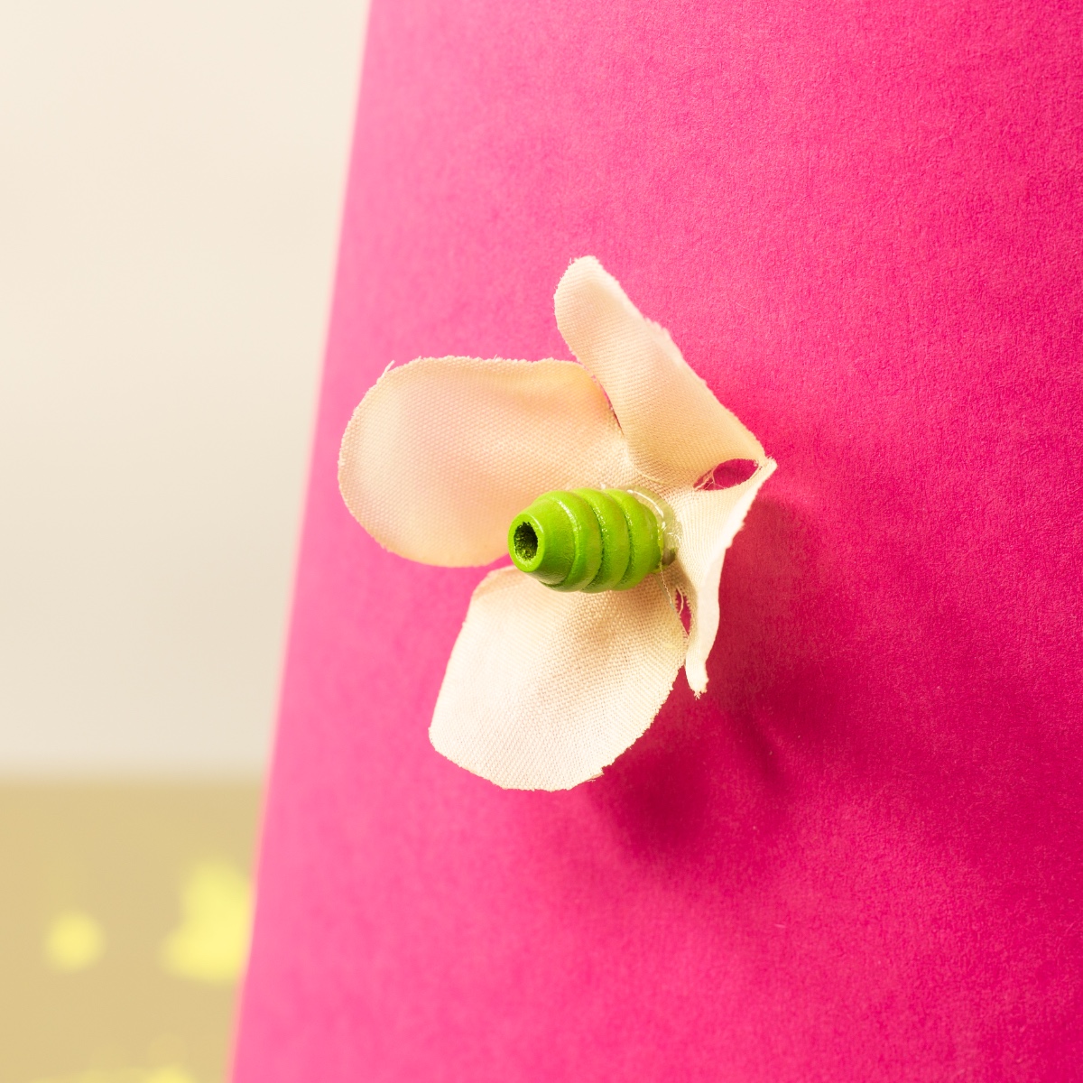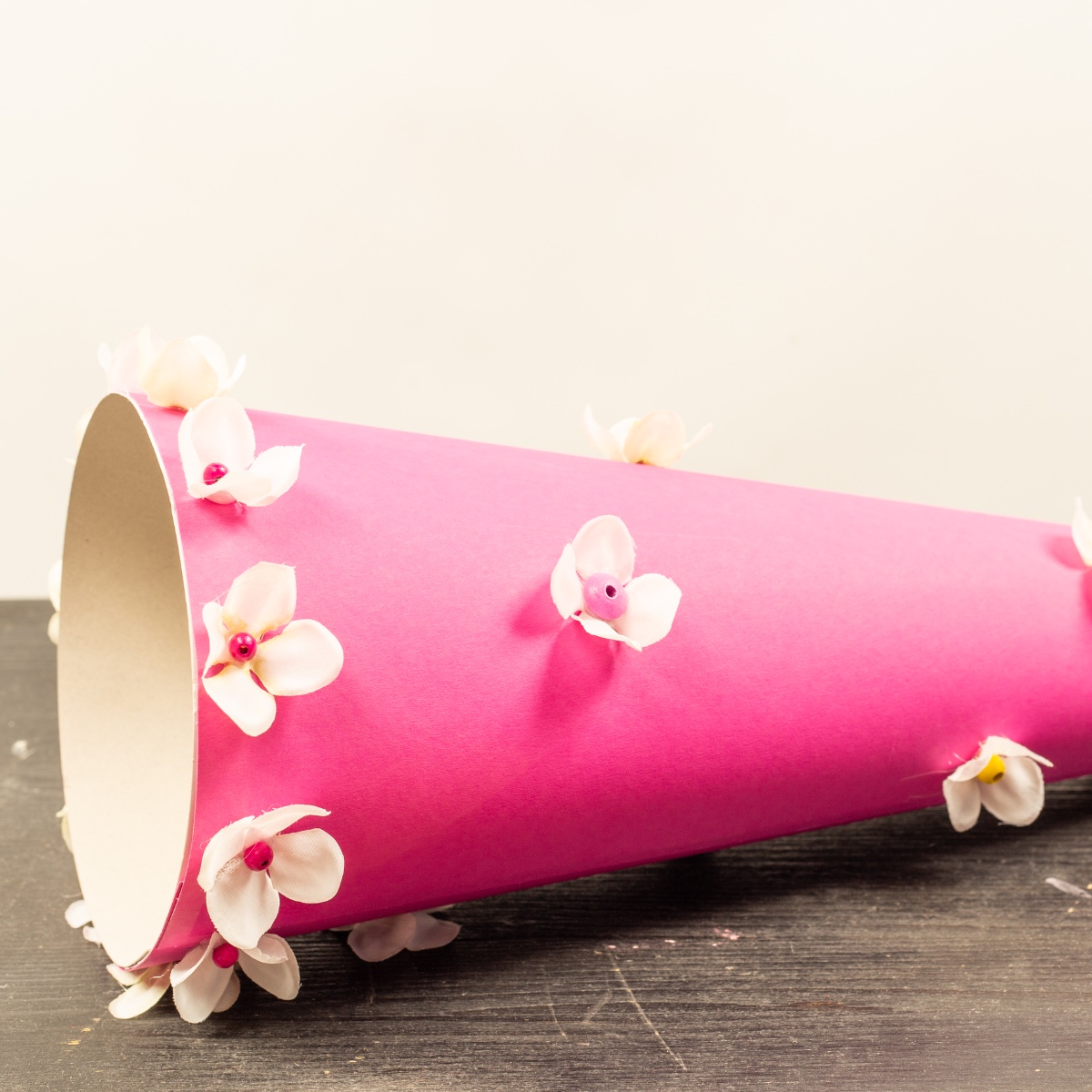 3. Mit der Heißklebepistole die Blüten auf die Schultüte kleben. Wir haben zum Festdrücken einen Bleistift verwenden, damit man sich nicht die Finger an dem heißen Kleber verbrennt. Dann, ebenfalls mit Heißkleber, in die Mitte der Blume eine farbige Perle kleben. Die Blumen gleichmäßig auf der Schultüte verteilen. Wir haben am Rand einen Ring aus Blumen gemacht.