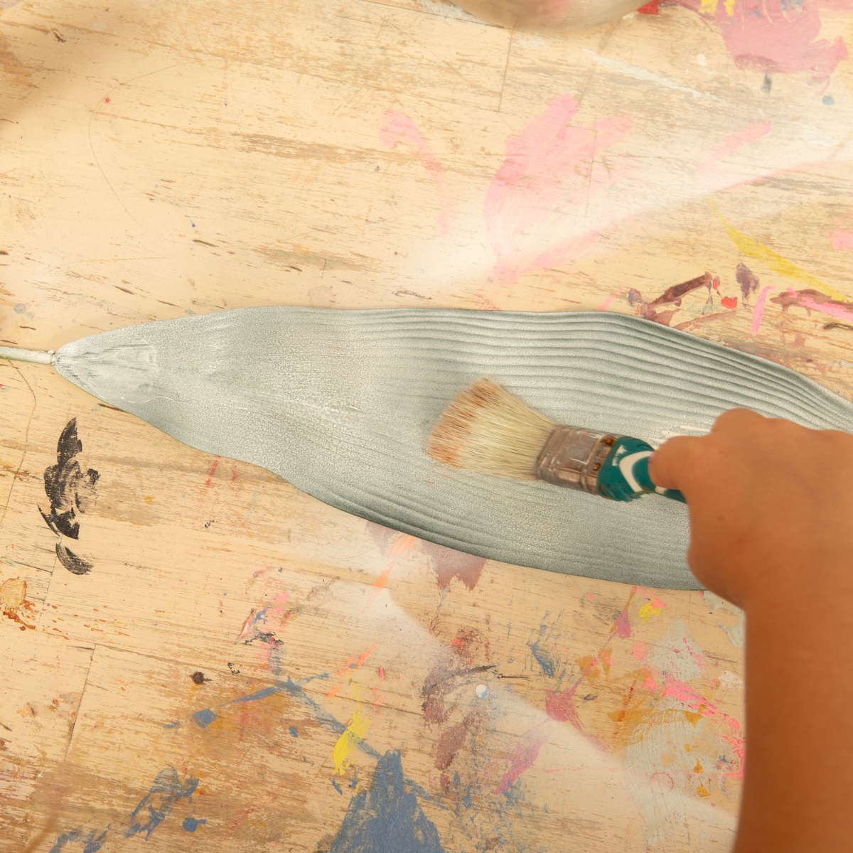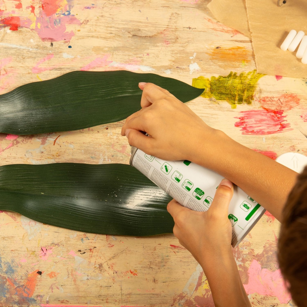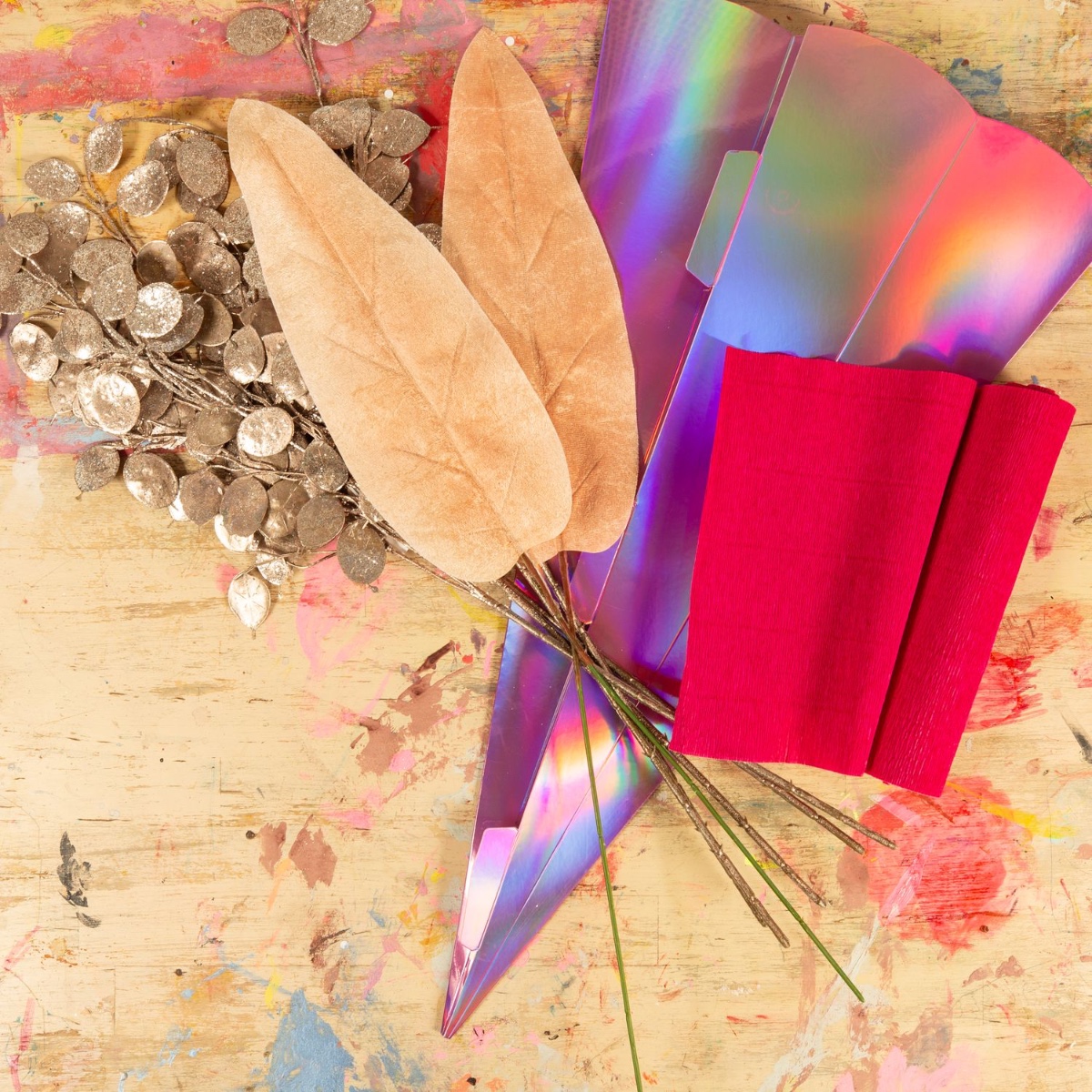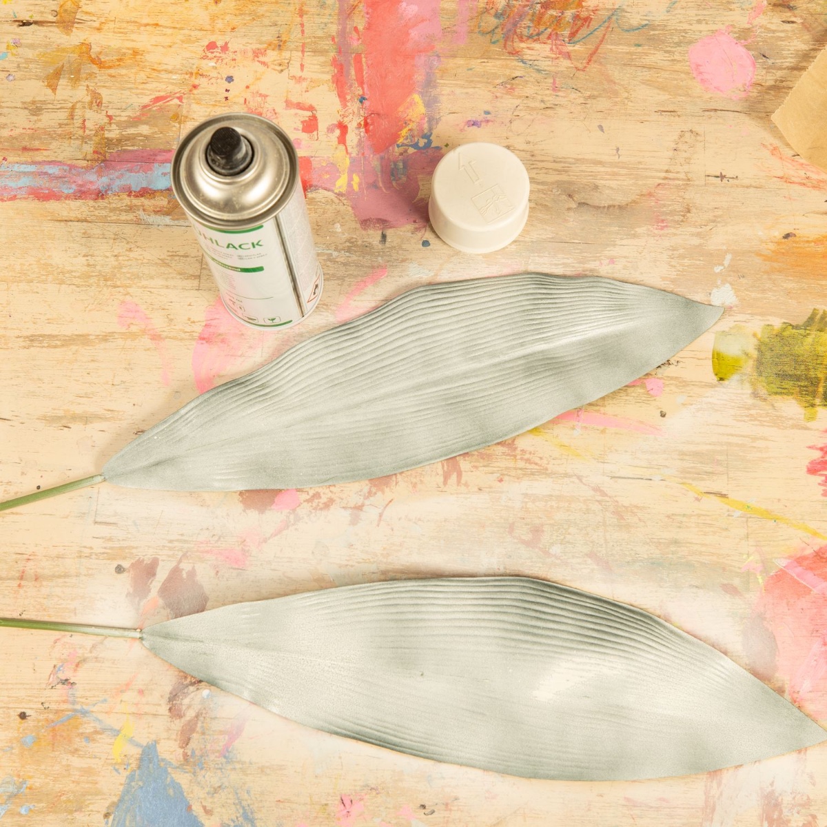 1. Die großen Blätter vom Stiel trennen und mit der gewünschten Farbe einfärben und trocknen lassen.