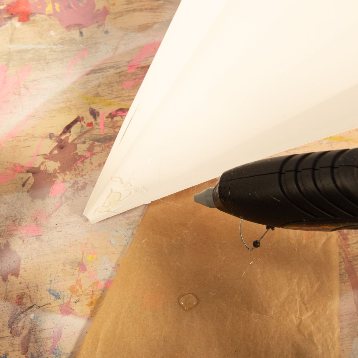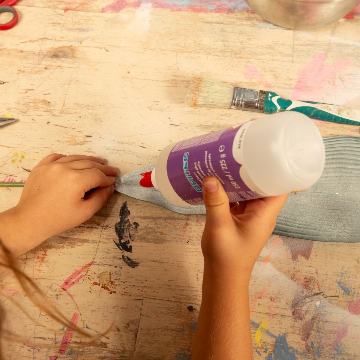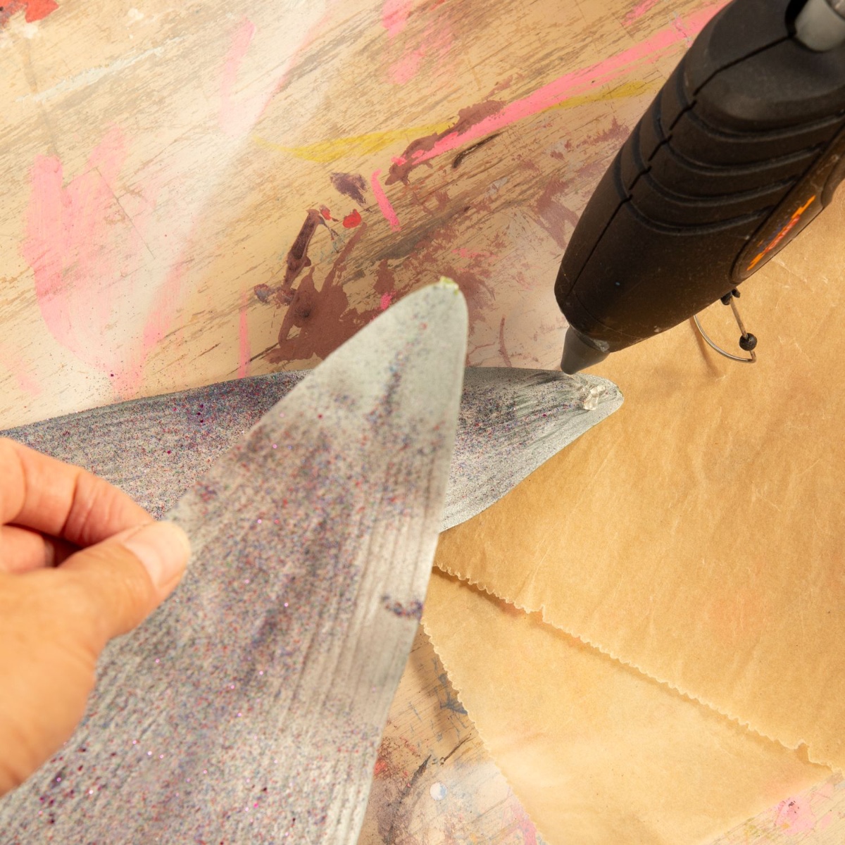 3. Die beiden Blätter mit der Heißklebepistole so zusammenkleben, dass eine Flossenform entsteht. Dann das Flossenteil in die Spitze der Schultüte kleben.