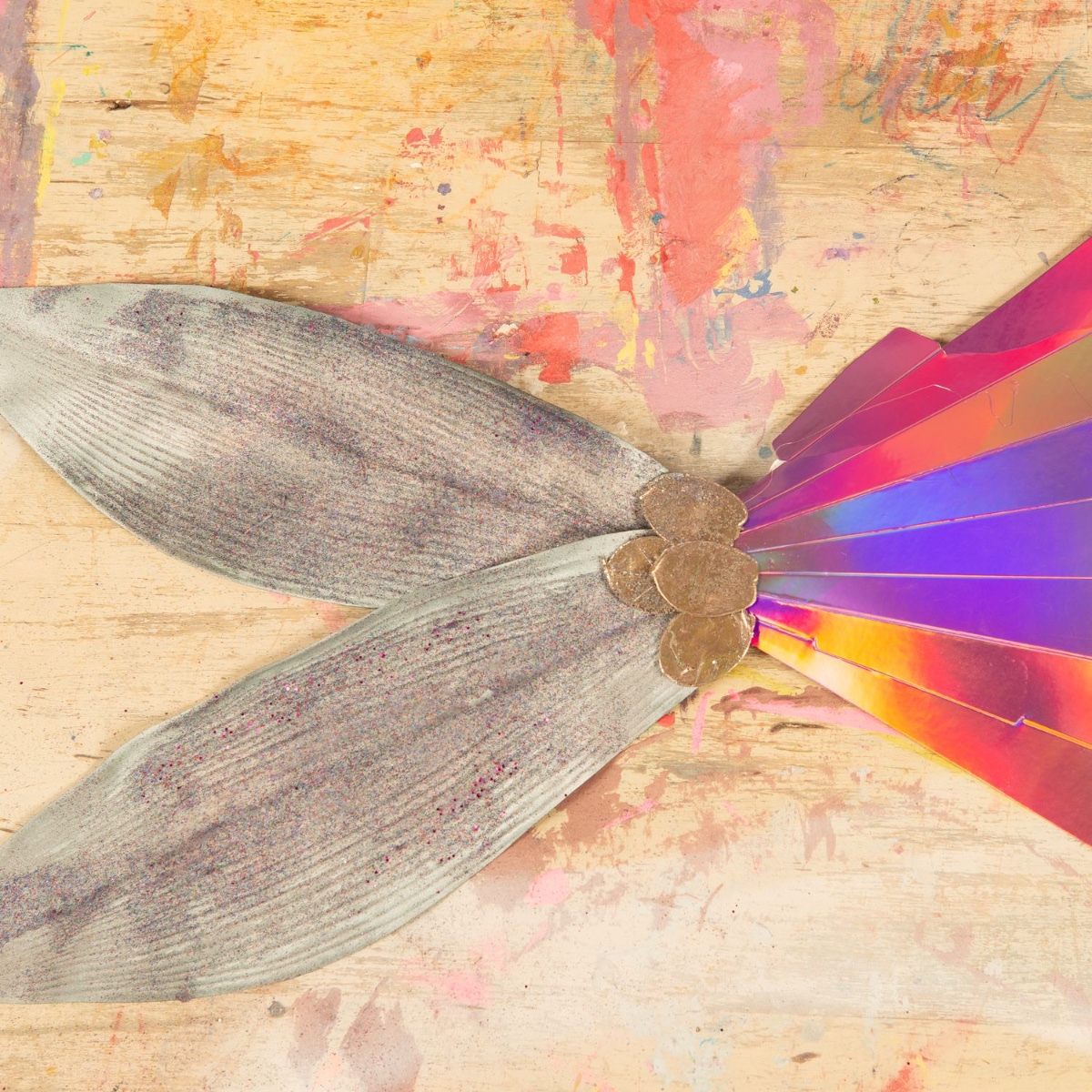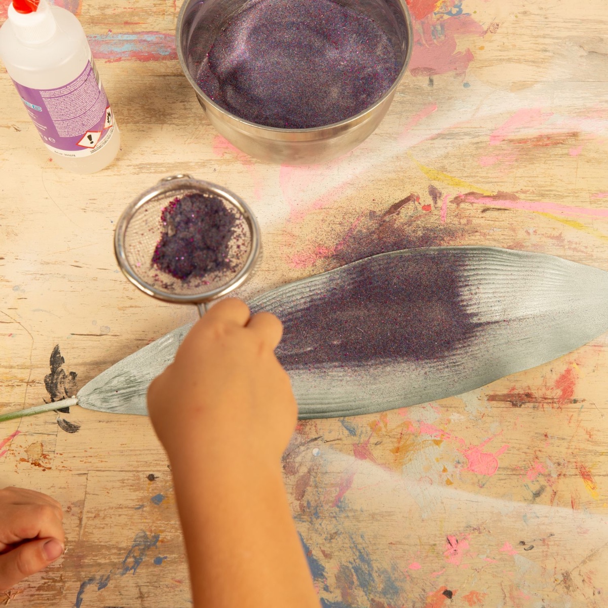 2. Auf die getrockneten großen Blättern mit einem Pinsel transparenten Flüssigkleberauftragen und den Glitzer darüber streuen. Auch auf der Rückseite.