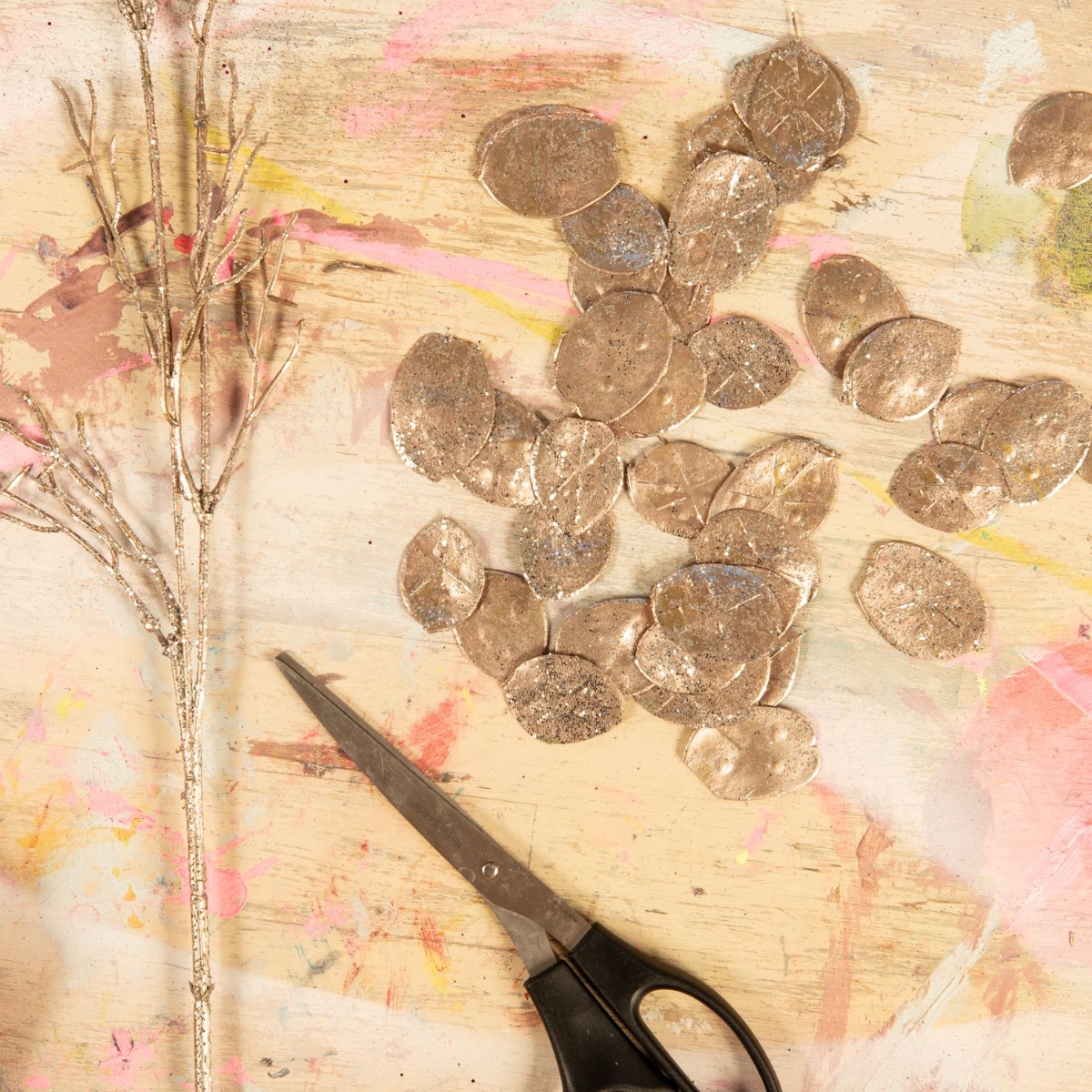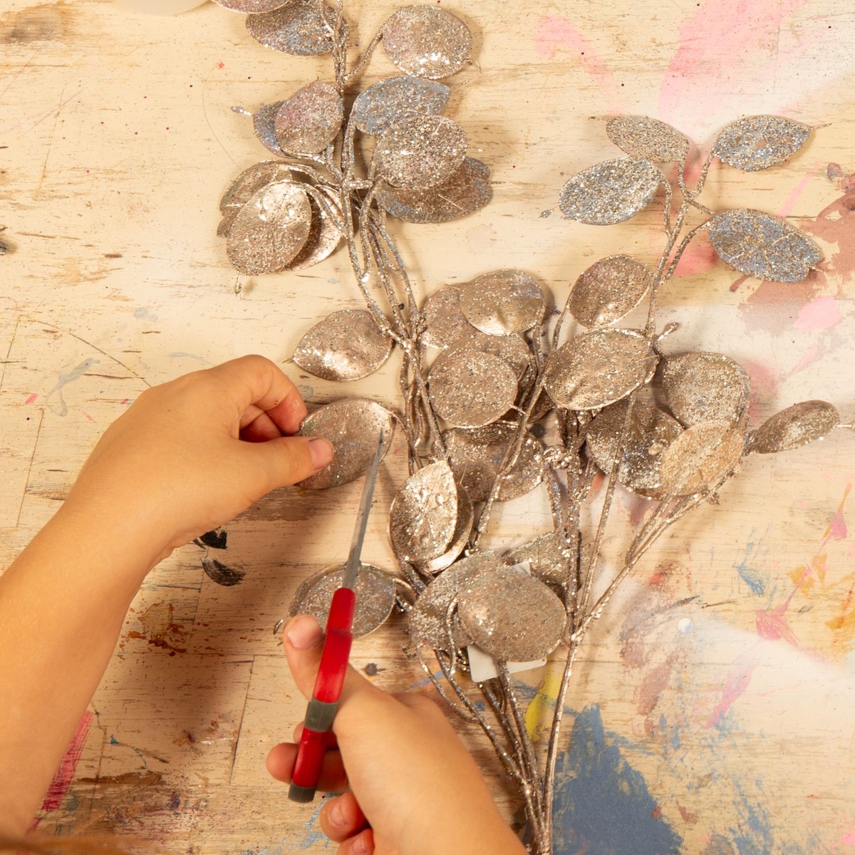 4. Die silbernen kleinen Blätter der Zweige abtrennen und eventuell mit der Schere etwas abrunden. Diese werden für die Fischschuppen verwendet.