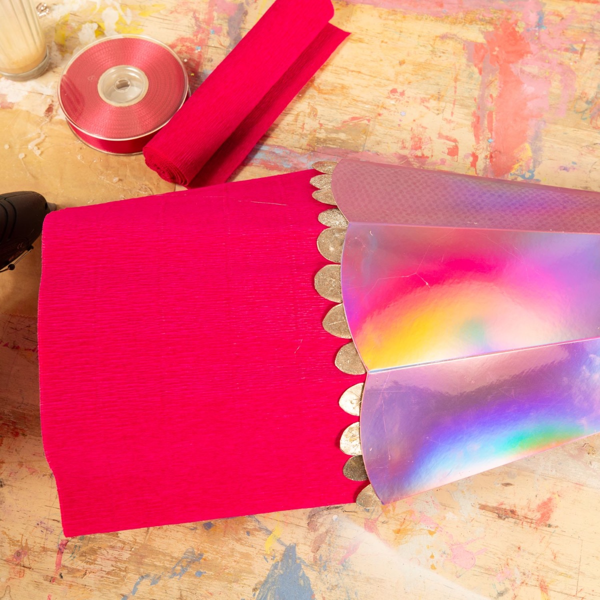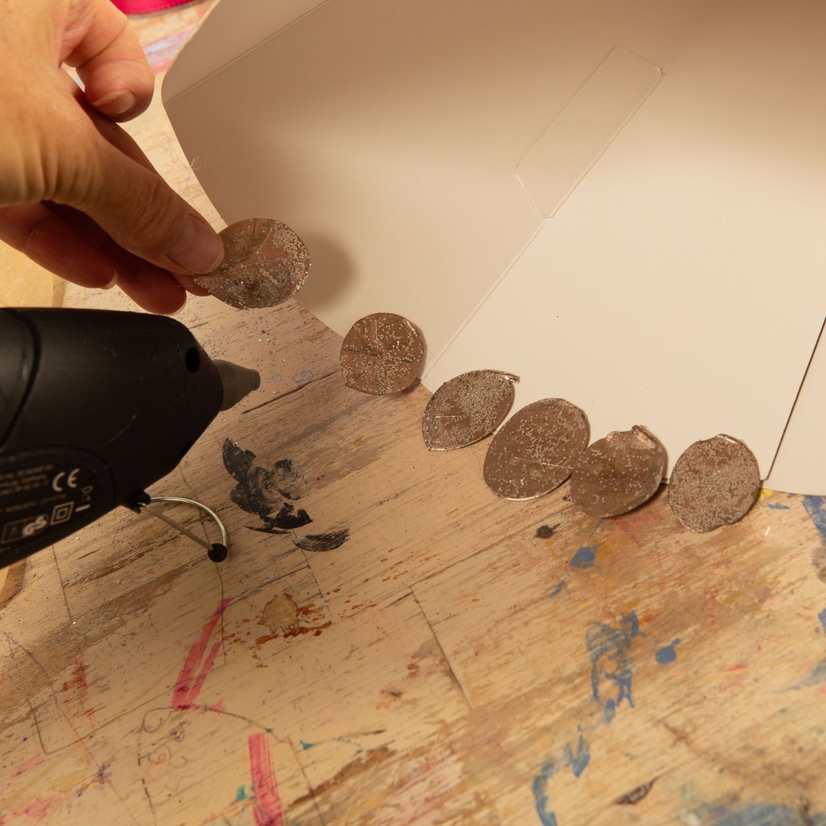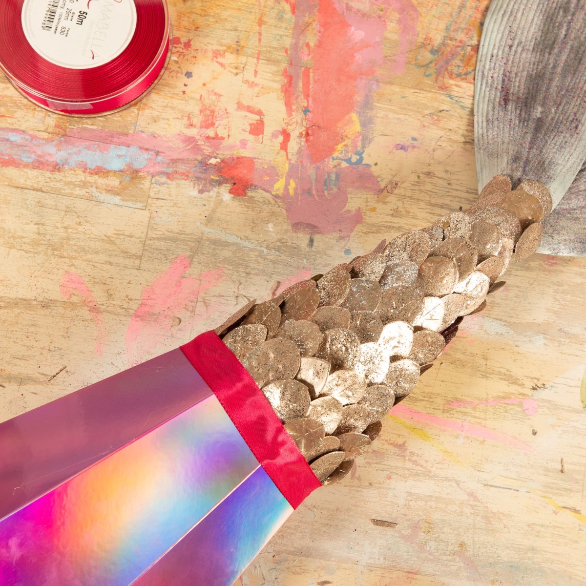 6. Als Abschluss haben wir ein Satinband mit Heißkleber am oberen Rand der Fischschuppen befestigt.
