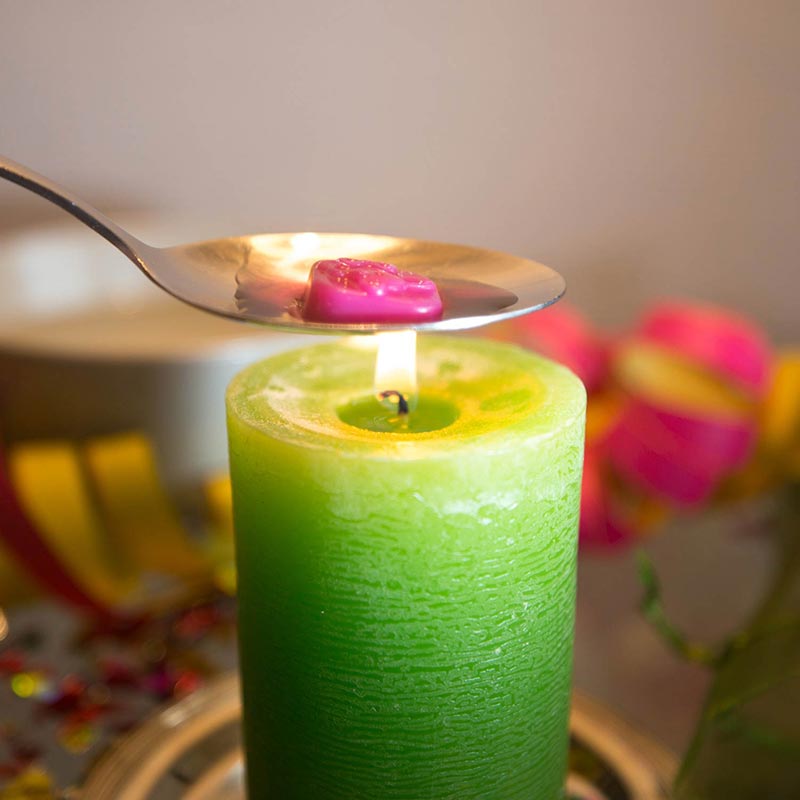 - Falls das Wachs weiß ist, kannst du es mit kleinen Stückchen von einem Wachsmalstift bunt einfärben. Diese werden einfach zu den Wachsresten dazu gegeben.