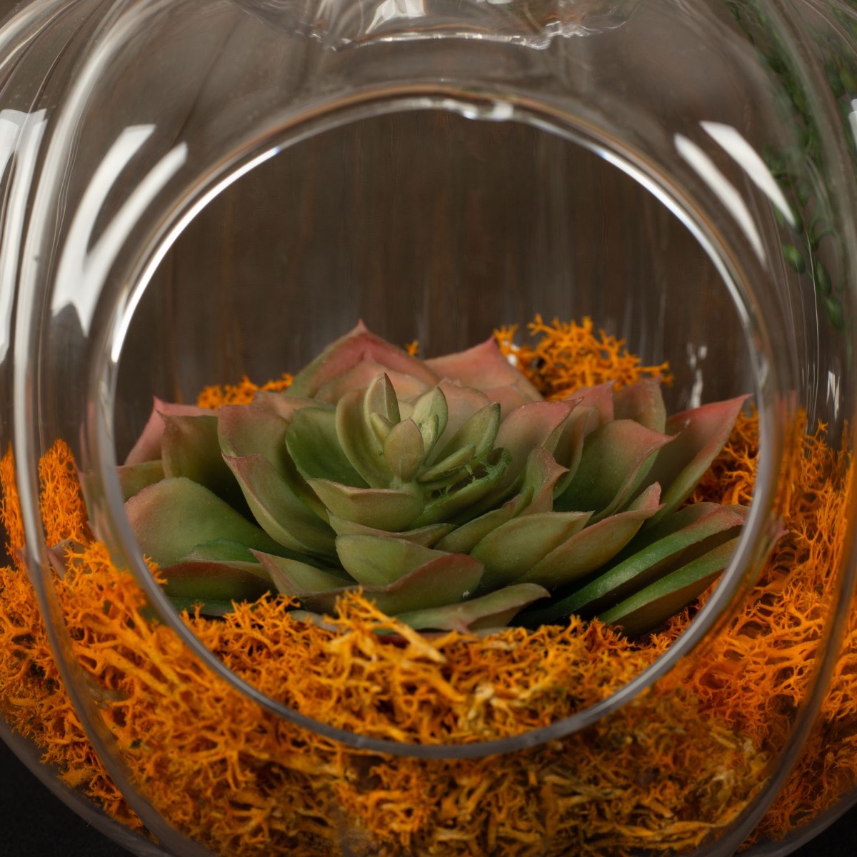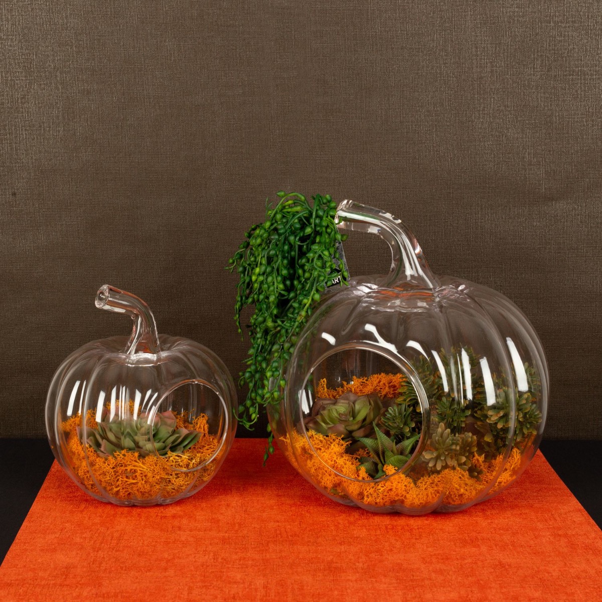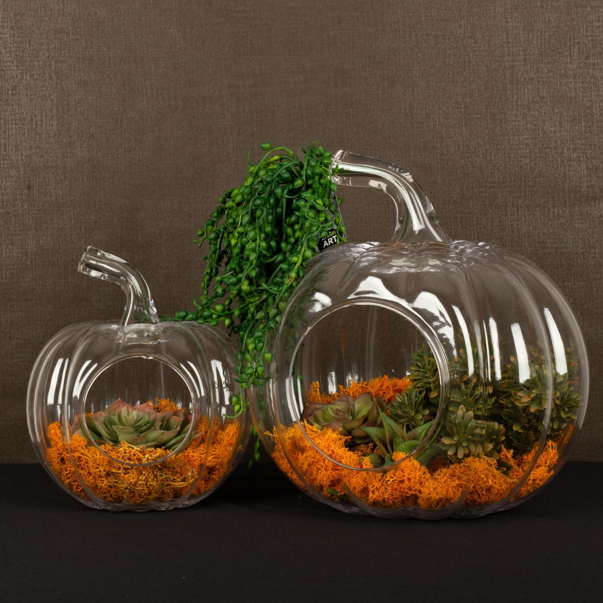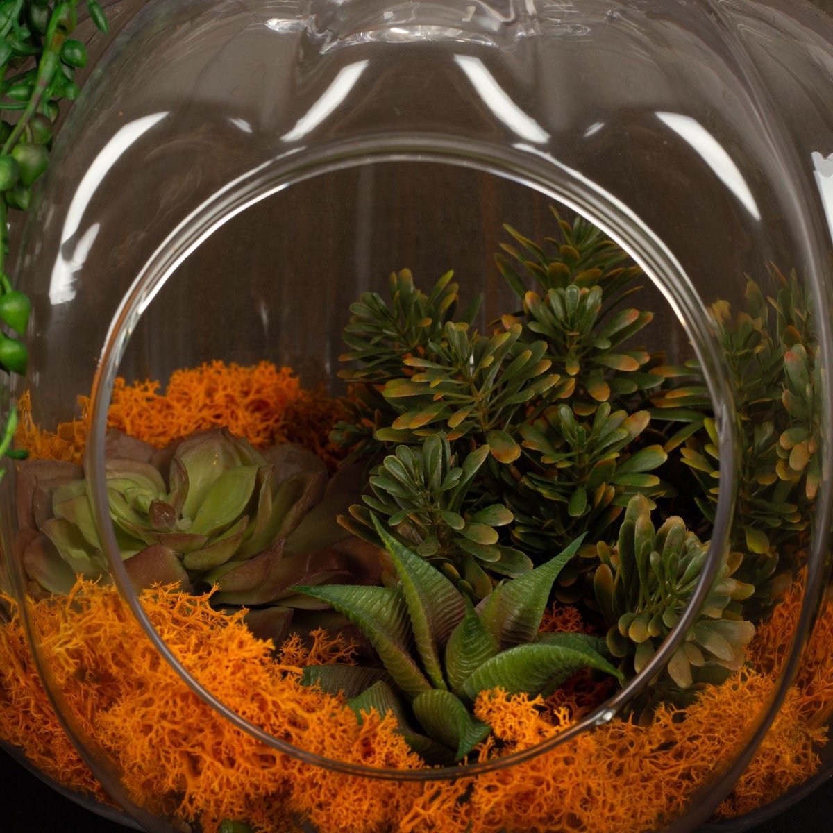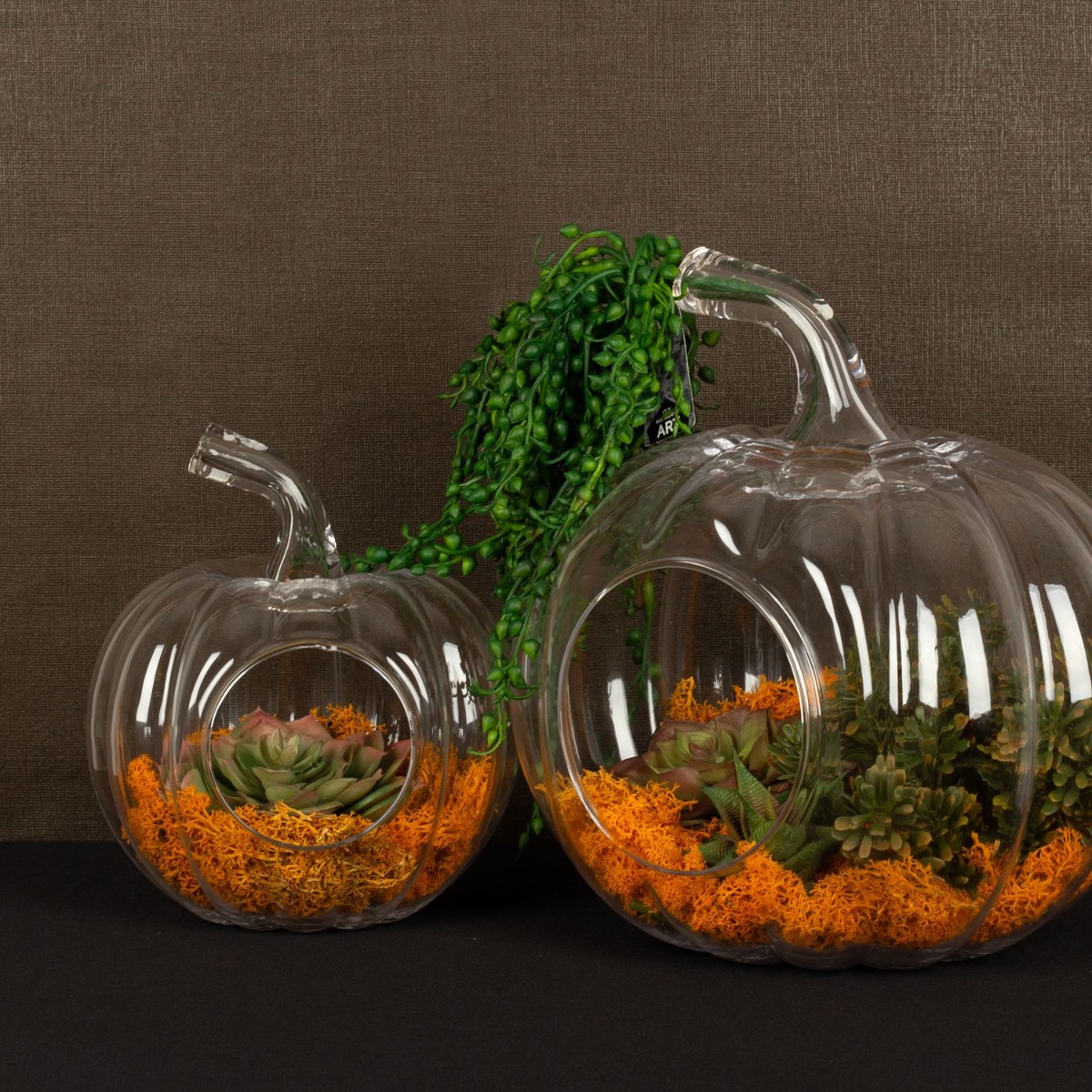Glas und Moos! Eine Kombination die immer gut funktioniert. Wir haben diesen herbstlichen Halloweenlook mal ganz dezent gestaltet, sodass sich diesmal keiner wirklich gruseln muss. Einfach schön leuchtet das orangefarbene Naturmoos in den Glaskürbissen. Die Sukkulenten eignen sich perfekt für die Gestaltung in Pflanzenterrarien. Eine tolle Deko für den Herbst. Shop the Look!