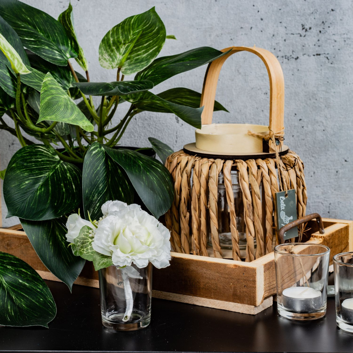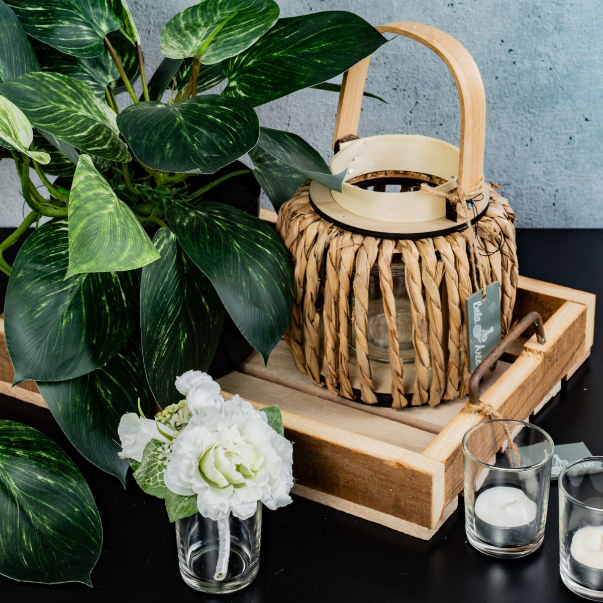 Gestaltungstipp: Stellen Sie die Kunstpflanze und die Laterne auf das Tablett und verteilen Sie die Teelichtgläser darum herum.