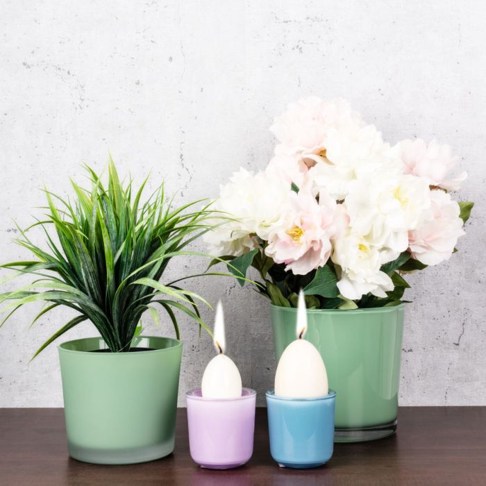 Pfingstrosen und Ostereier! Das geht nur mit Kunstpflanzen! Denn die Pfingstrosen blühen erst, wenn Ostern längst vorbei ist. Unsere zartrosa und cremefarbenen Pfingstrosen sind ein echter Hingucker, vor allem wenn sie mit einem Jadegrünen Topf kombiniert werden. Dieser Look zeigt, dass ein farbenfrohes Ostern auch anders als mit Gelb, Blau und Orange gestaltet werden kann. Flieder, Himmelblau und Jadegrün ergeben eine fröhliche Farbmischung, die nicht nur an Ostern gut aussieht. Shop the Look!