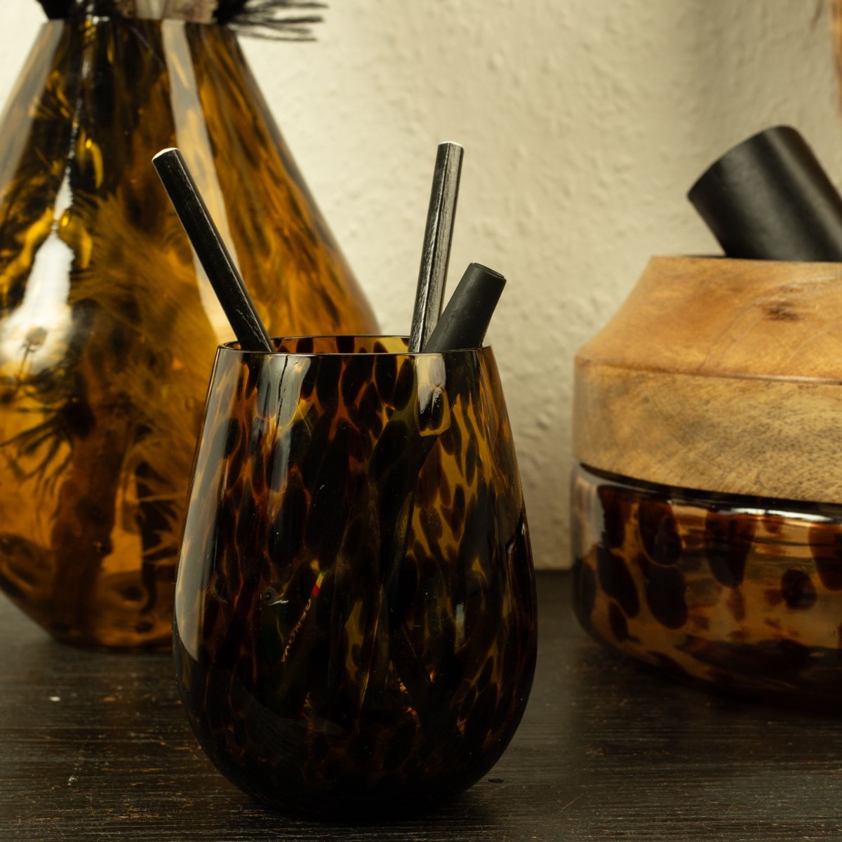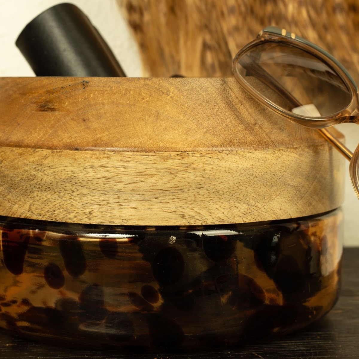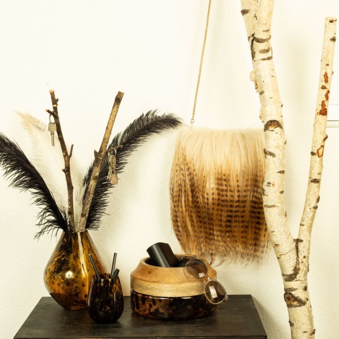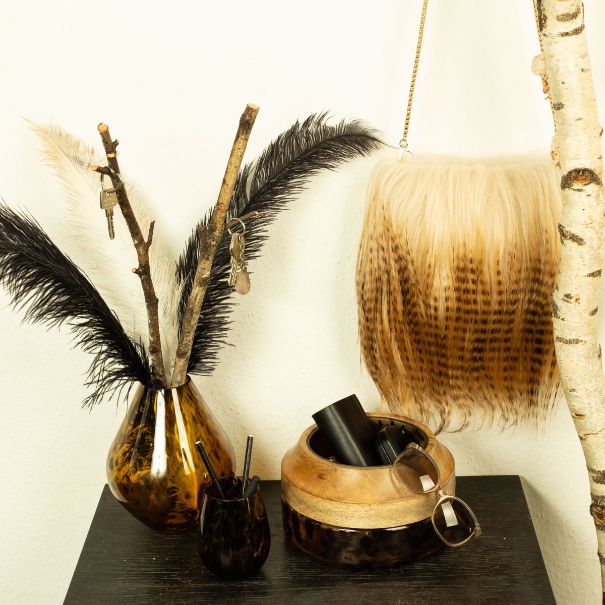 Leo-Print und Federn! Mit diesem Look zeigen wir mal, wie vielseitig einsetzbar unsere Produkte sind. Die Glasprodukte mit Leopardenmuster aus der Serie RUSSELL wurden hier total zweckentfremdet. Die Blumenvase, die mit Federn und Birkenzweigen bestückt wurde, dient als Schlüsselhalter. Das Trinkglas ist ein Stiftehalter und die Glasschale mit Echtholzrand eignet sich super als Aufbewahrung für Sonnenbrillen, Geldbörsen und andere Dinge. So hat man alles, was man an einer Garderobe braucht. Die Felltasche ist ein „must have“ für alle Animal Fans. Shop the Look!