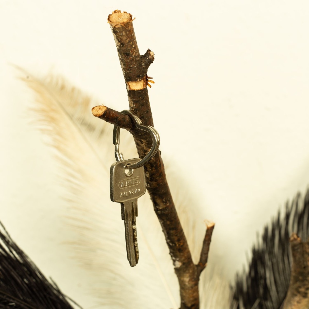 Gestaltungstipp: Zwei schwarze und eine weiße Feder in die Vase stecken und 2-3 Birkenzweige dazugeben. Darauf achten, dass die kleinen Verästelungen nach oben zeigen. So kann man seine Schlüssel dranhängen. Achtung! Bei größeren Schlüsselbunden empfehlen wir die Vase mit Sand zu befüllen, nicht dass sie unter der Last des schweren Schlüsselbunds umfällt.