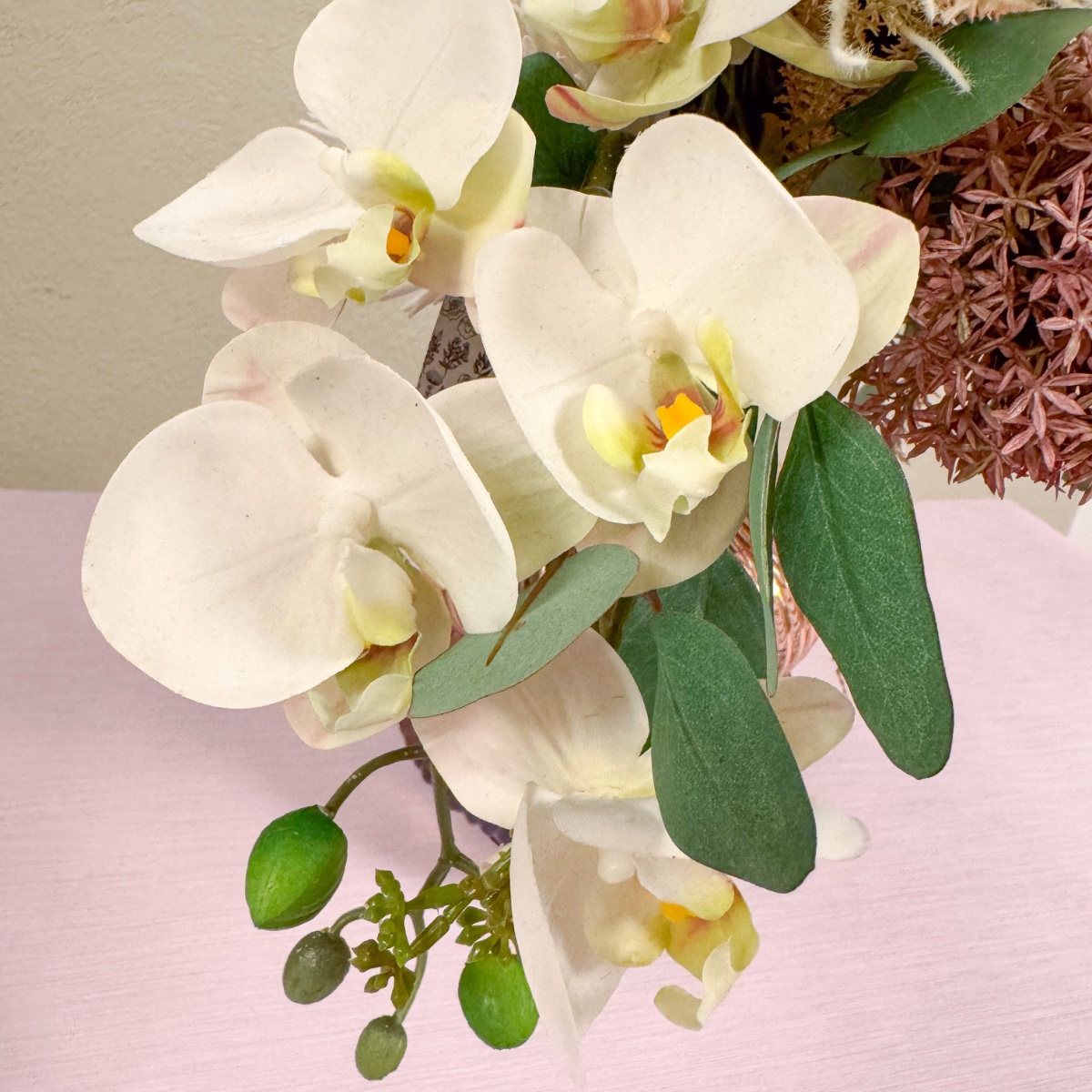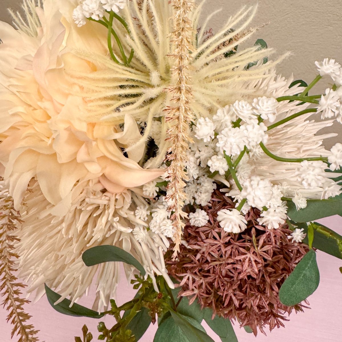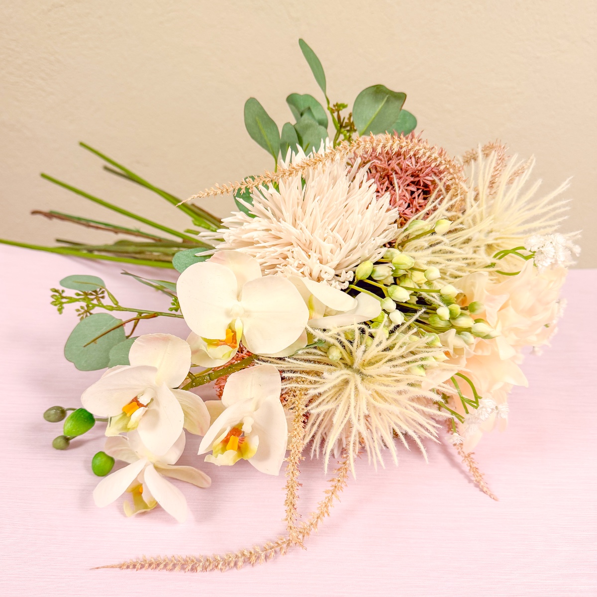 Wilde Chrysantheme und elegante Orchidee! Für ihr Hochzeitskleid in zartem Blush fehlte nur noch der passende Brautstrauß. Orchideen sollten auf jeden Fall dabei sein – kombiniert mit Blumen, die farblich perfekt auf das Kleid abgestimmt sind. Entstanden ist ein eleganter Strauß, der die sanften Töne des Outfits aufgriff und Celinas Look auf stilvolle Weise vollendete. Shop the Look!
