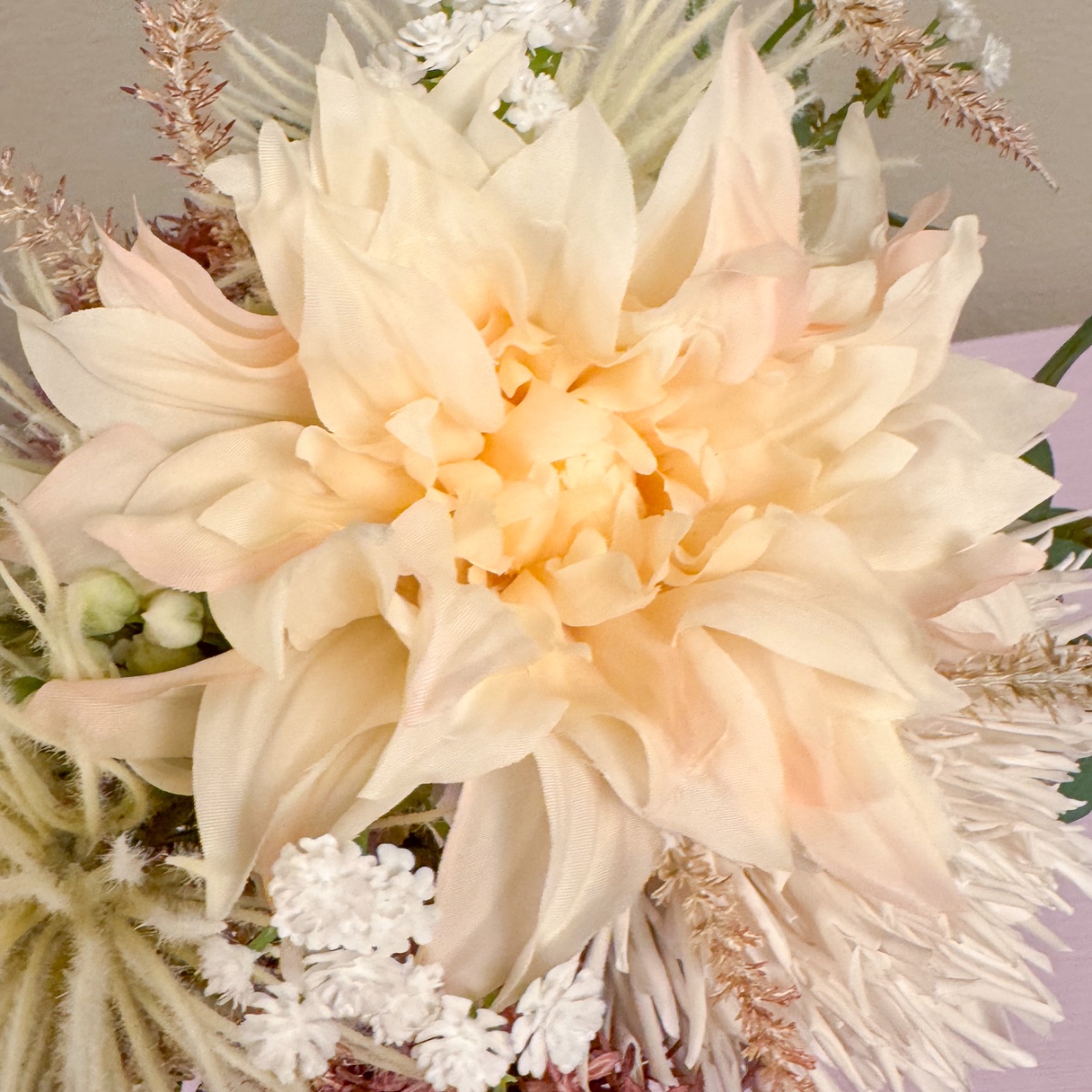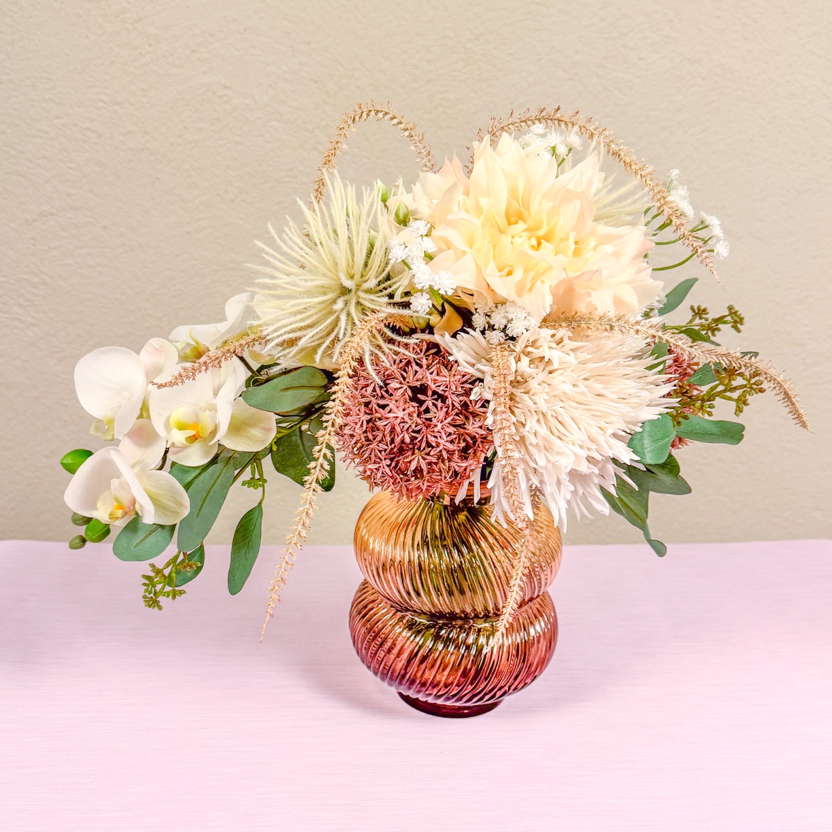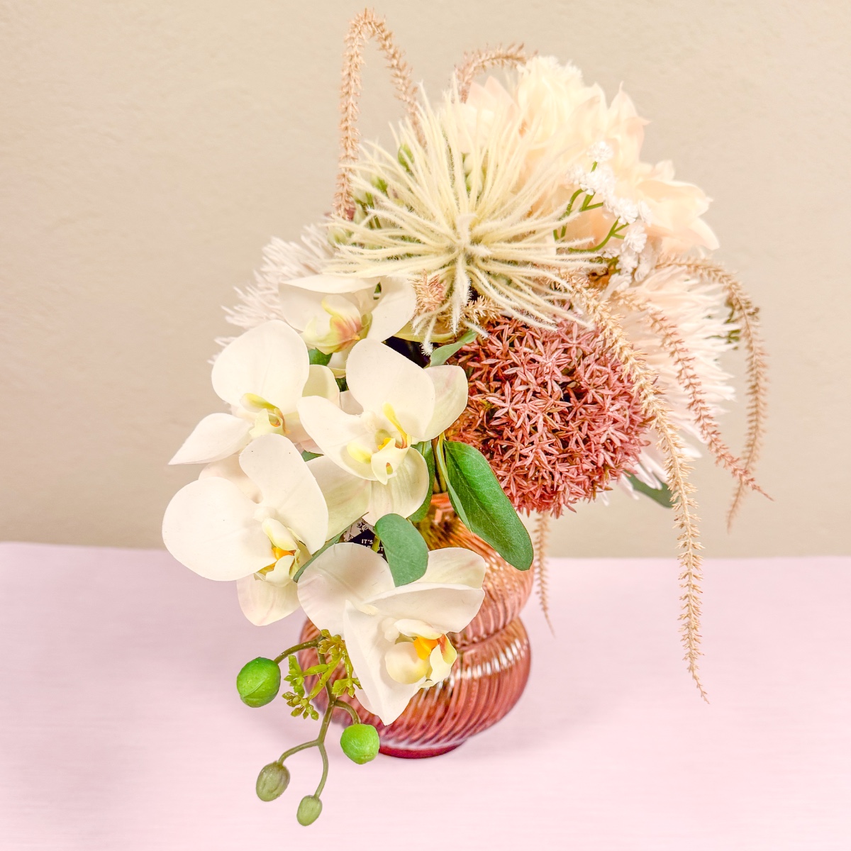Wilde Chrysantheme und elegante Orchidee! Für ihr Hochzeitskleid in zartem Blush fehlte nur noch der passende Brautstrauß. Orchideen sollten auf jeden Fall dabei sein – kombiniert mit Blumen, die farblich perfekt auf das Kleid abgestimmt sind. Entstanden ist ein eleganter Strauß, der die sanften Töne des Outfits aufgriff und Celinas Look auf stilvolle Weise vollendete. Shop the Look!