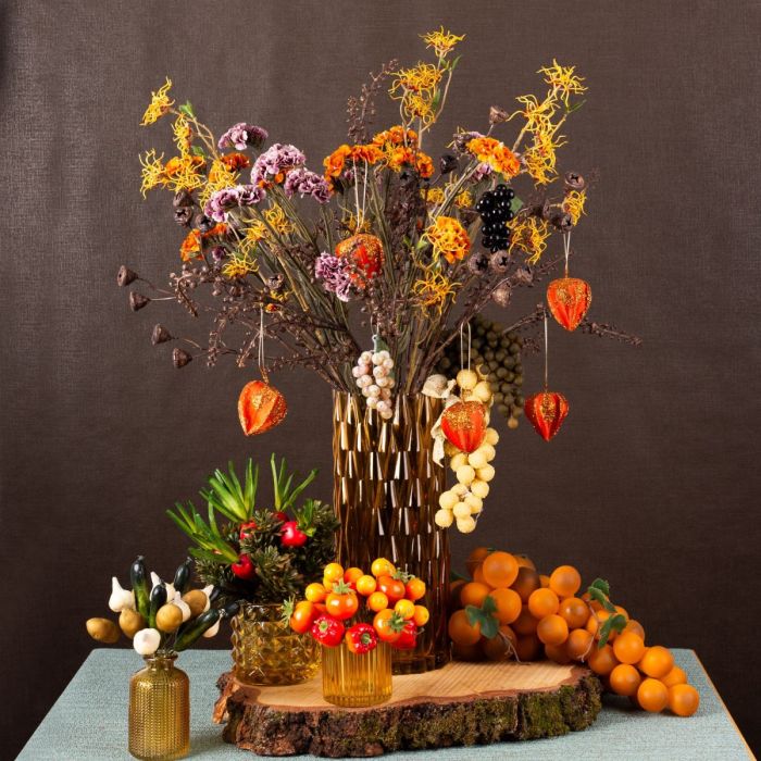 Bunt und schön! So ist der Herbst. Neben den wundervollen Farben, die der Herbst hervorbringt, gibt es eine viel wichtigere Sache, die im Herbst passiert. Die Ernte! War es ein guter Sommer, so ist die Ernte im Herbst besonders erfolgreich. Ein Grund mehr, um die Früchte der getanen Arbeit mal zu zeigen. Physalis, Trauben, Tomaten, Paprika, Orangen, Radieschen, Gurken, Kartoffeln und sogar Knoblauch dienen hier als Tischdeko und verzieren den Strauß aus Spätsommerblumen. Die verschiedenen, gelben Vasen schimmern im Licht der Sonne und sind für viele Dekoideen einsetzbar. Shop the Look!